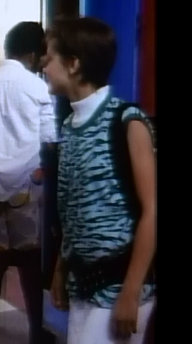 We don’t see Caitlin too much in this episode, but luckily we get a little glimpse of more of her fashionable choices. She wears a blue zebra striped sleeveless top over a white turtleneck sleeveless top. With it she wears a big belt around her tiny waist, and a white skirt.