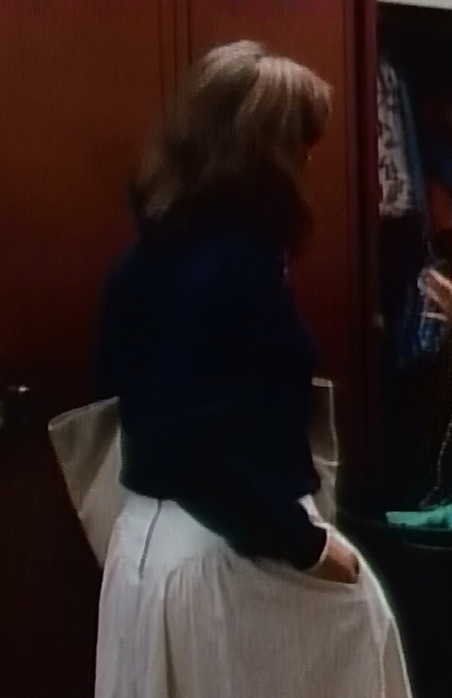 As she stumbles upon the Stephanie Kaye Second Hand Store, Alexa is wearing a navy sweater, with a blue paisley bandanna around her neck, and a white peasant skirt.. with POCKETS!