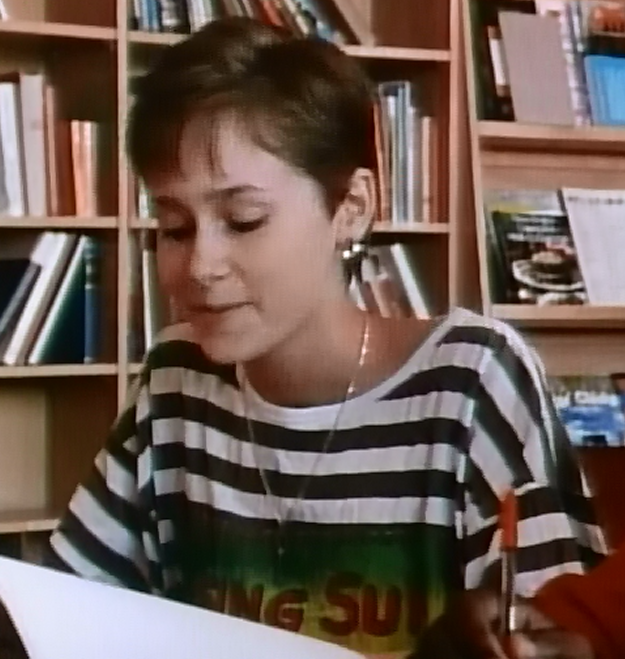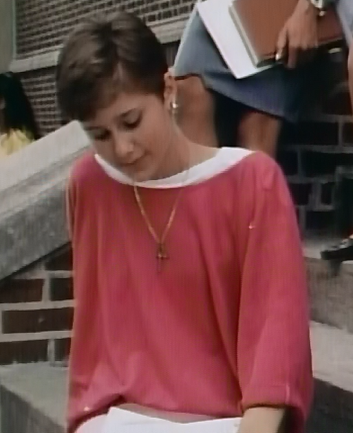 Caitlin is steaming with jealousy when she finds out Rick walked Kathleen home. Her teal colored graphic tee is cute, with of course, gold hoops and a headband.