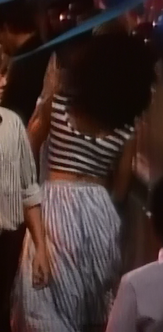 We all know Lucy is a fashionista, so I was excited to obtain this albeit brief image of her dance ensemble. She’s wearing a black-and-white-striped crop top, which is just my style, and a long flowy skirt with either grey or blue vertical stripes. Kind of a weird combination, but I love the silhouette,