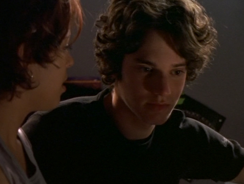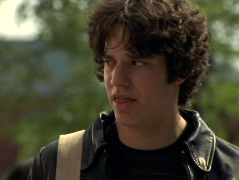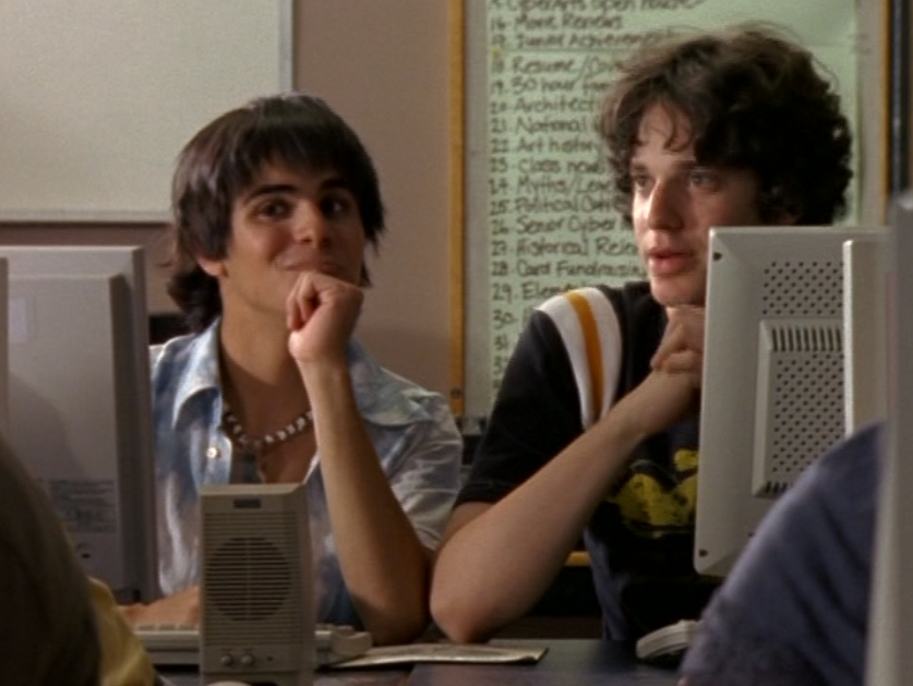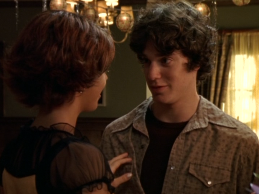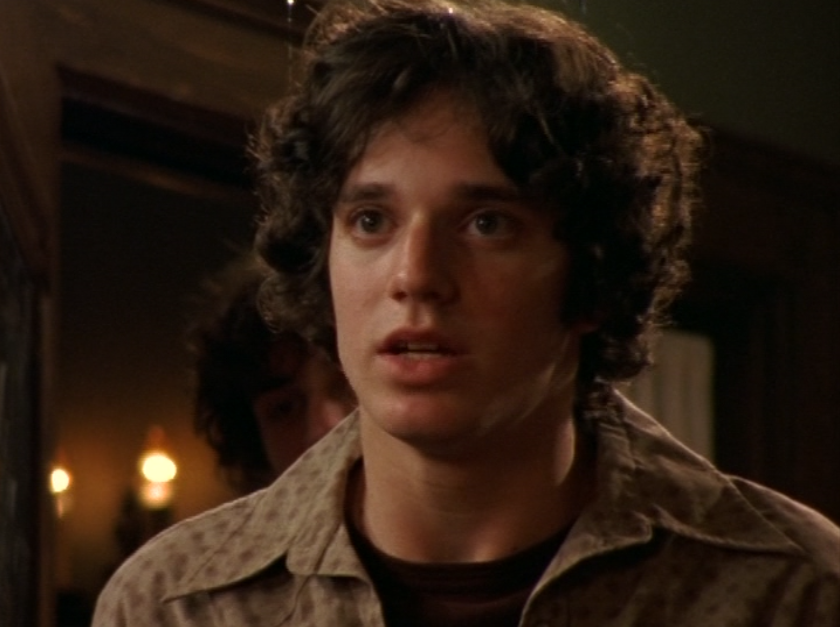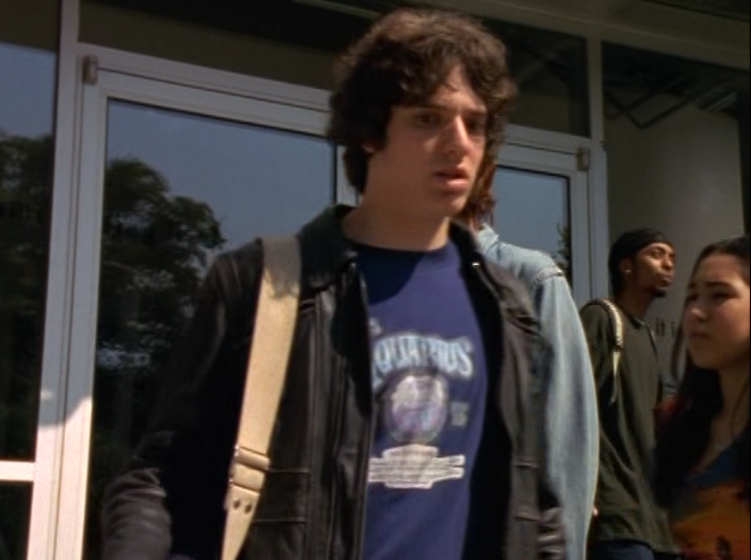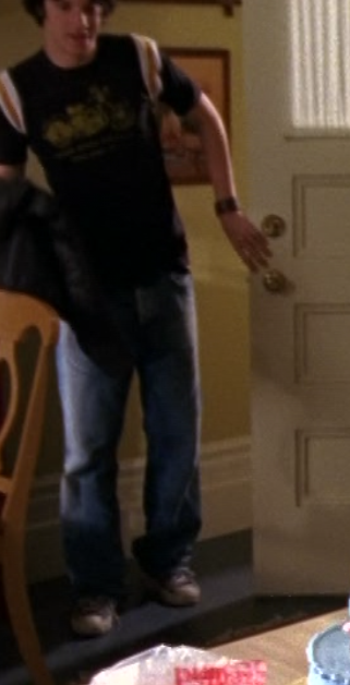 Great, a whole lotta Craig. First, I got this shot of him trying to get into Ashley’s pants because we see a brown leather armband. Then we see him in his leather jacket, wide-legged pants, Converse, athletic-inspired tees. For sex night, he wears a gross brown button-down with like an extra large collar. And lastly… an Aquarius shirt? Is Craig and Aquarius? Or is that supposed to be a band?