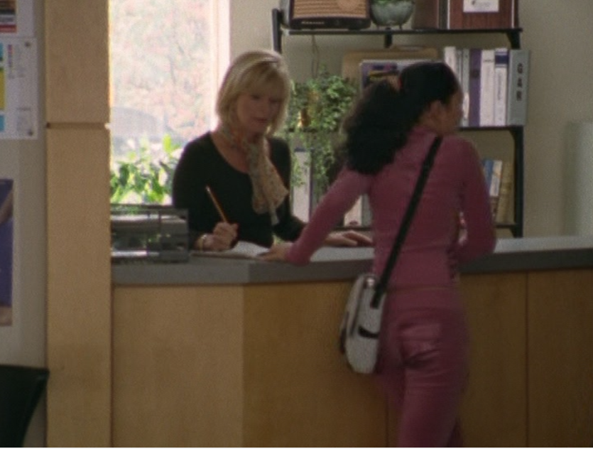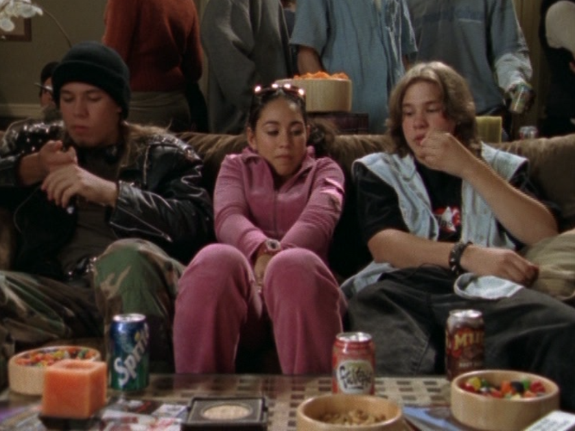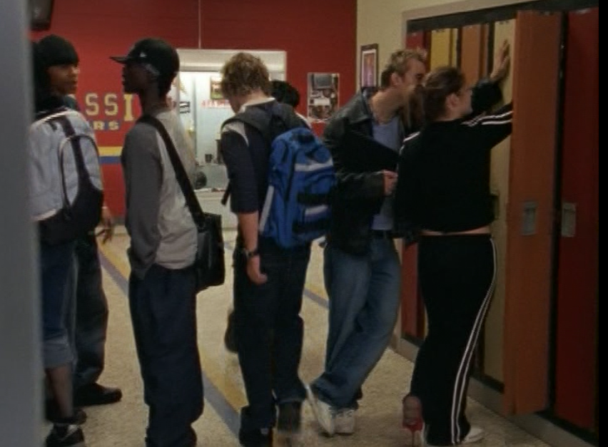 It’s time for the random person and group shots category! First is this Supafly Fries guy. I was able to find out with my sleuthing skills that his name is Stan. He kinda looks like Marco. Then is some lady at the desk who THANKFULLY is not that mean Ms. Smith. She wears a neck scarf and a scoop neck top. Then I have a hallway shot here, simply showing the wide array of baggy and athletic-inspired clothing. Then, a shot of spirit squad practice. This next shot is great. Dude, these two guys have been very faithful extras on the show. The guy on the left is “you + me = destiny”! Their style is super cool and must have inspired the Lakehurst jerks who come in later on. Vests, camo, spikes, leather, beanies, and the like. Finally, this server from the restaurant. His name is Andrew. The fact that I know his name AND we see him more than once tempts me to give him his own post.