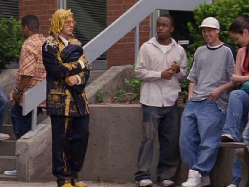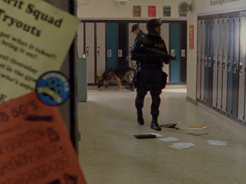 Time for the “rando roundup” as I used to call it! Just the group pictures and random people. First we have these baggy-clad dudes laughing at Rick. Then a girl with a side part, braces, and a boat neck top. Then a couple of cops, swat guys, investigators, etc. And a shot of some girls evacuating the school wearing some very typical low rise pants with tight shirts.
