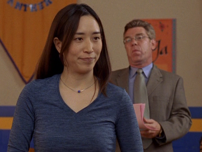 Kwan has let her hair down, which looks beautiful! And she wears a classic Kwan shirt, a v-neck 3/4 sleeve blue top. I keep saying this, but I know I have transitioned from the age of the students to the age of the teachers when I realize Kwan is actually super hot.