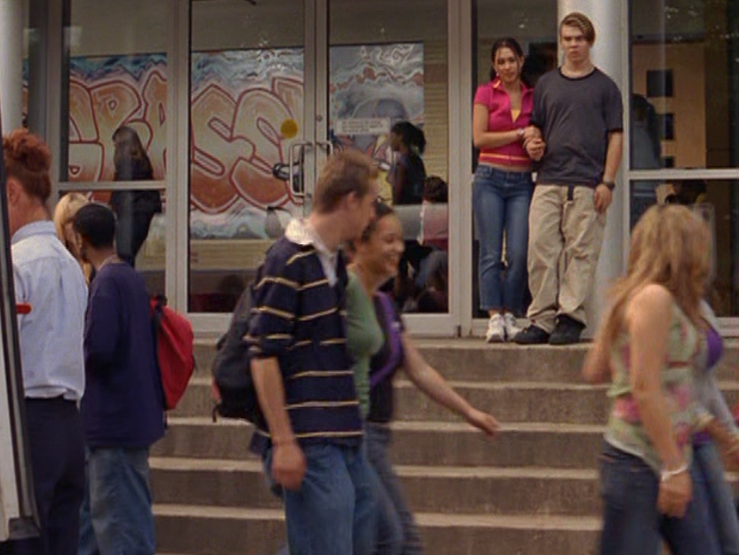 Manny doesn’t get much screen time in this episode. First, we see her in the distance here, and she is wearing these pants that would have been absolutely unacceptable in 2004 and no one can convince me otherwise. These aren’t capris – these are FLOOD PANTS and they are an abomination in this context. Next outfit is.. ohhh this is when she’s already shunning Spinner I think. She’s got sleek straightened hair, these 1960s gogo looking earrings, and a lace up halter.
