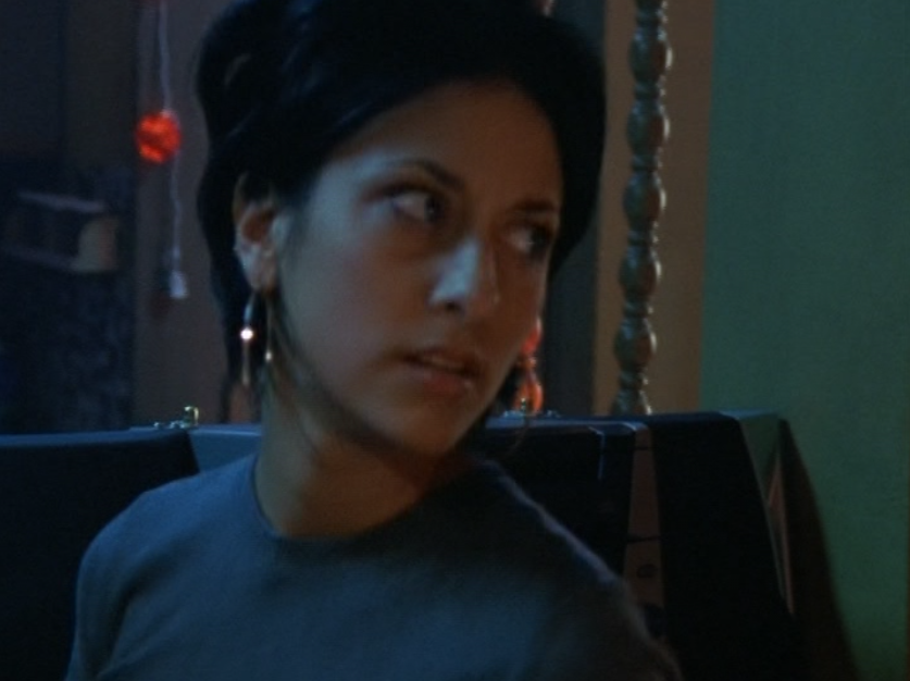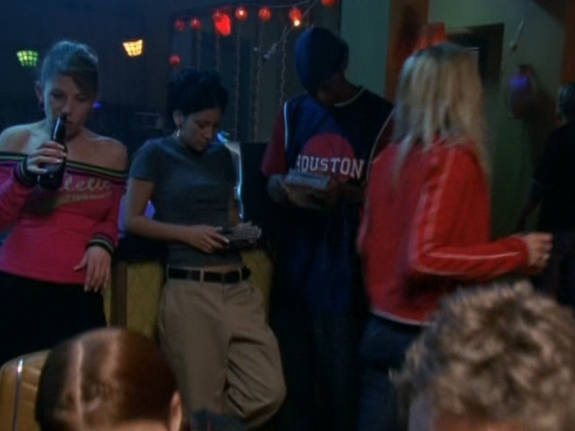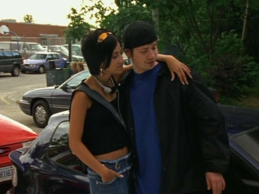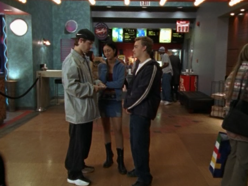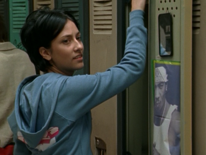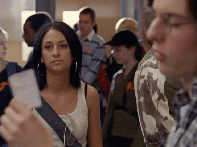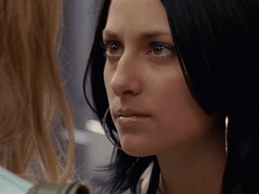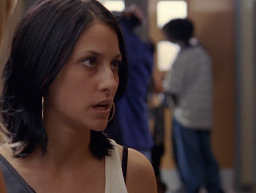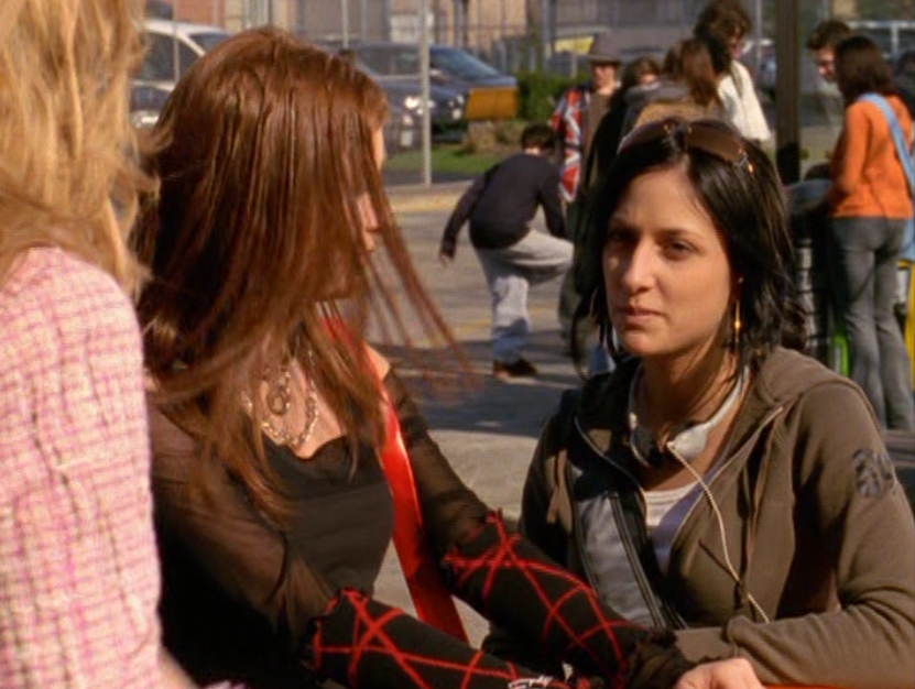 A new episode, and we start off featuring scary, scary Alex. Her hair is jet-black as ever. First we see some casual khakis, with a black tank and of course those exposed bra straps. Ohh man look at these nails! Square-shaped French manicure. She wears her giant hoops, and her tinted shades tucked into her grey fitted tee. We get a brief moment of color here with this green tank and jeans, but then it’s on to this awful brown movie theatre uniform. Gotta hand it to her for adding so much personality to it, though, with the giant hoops.