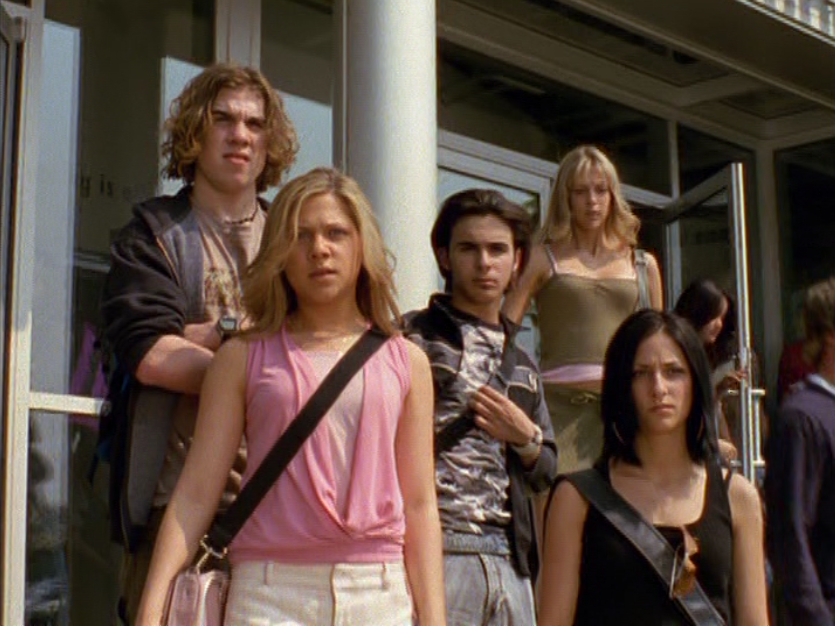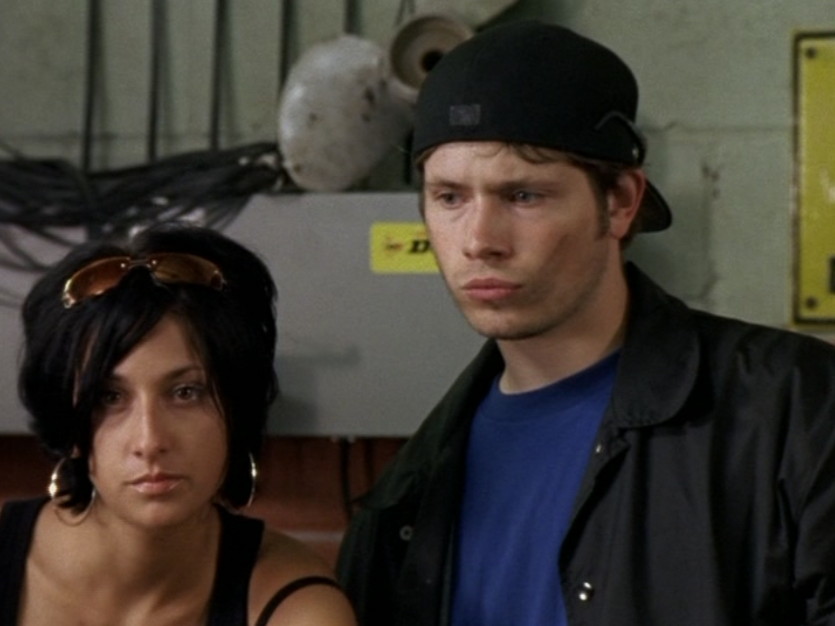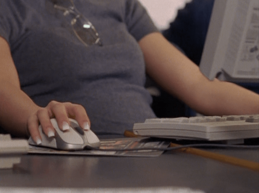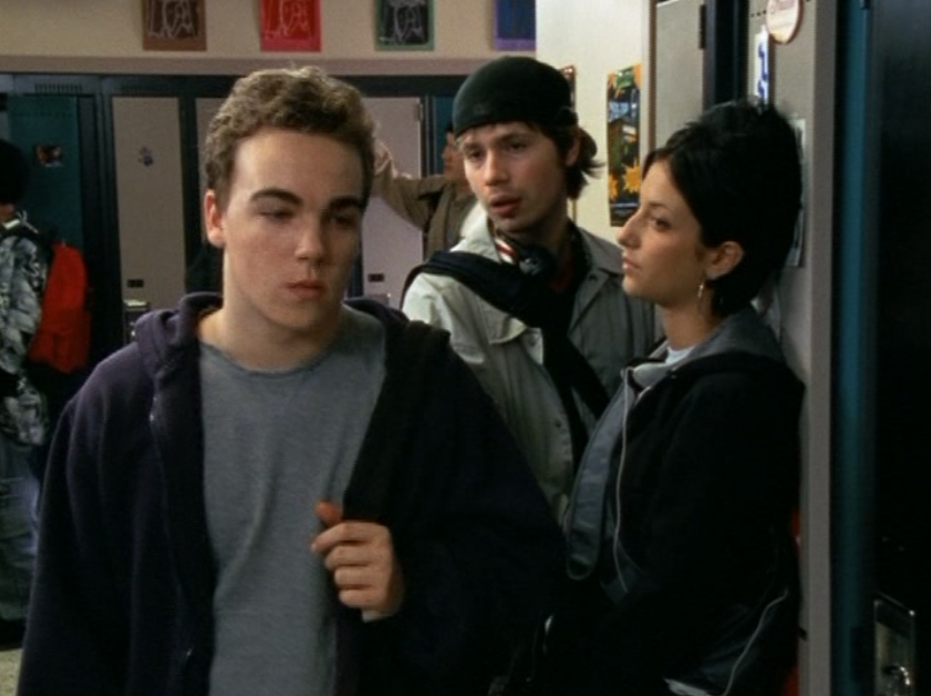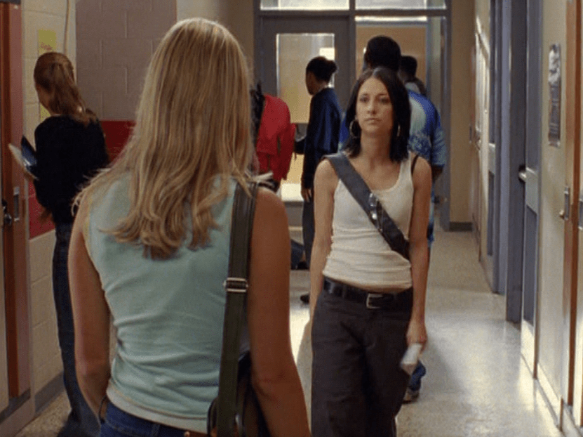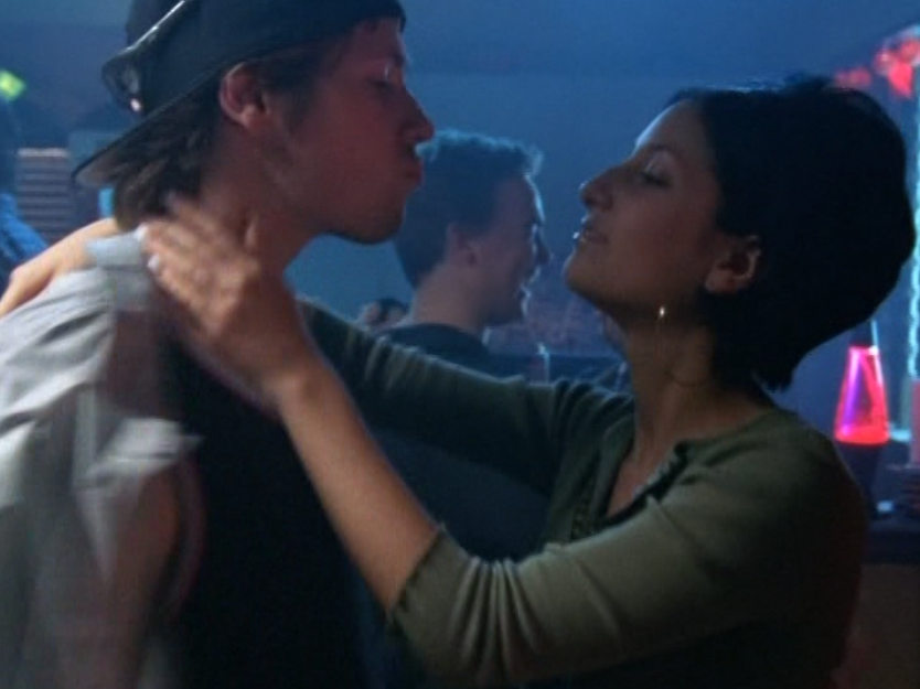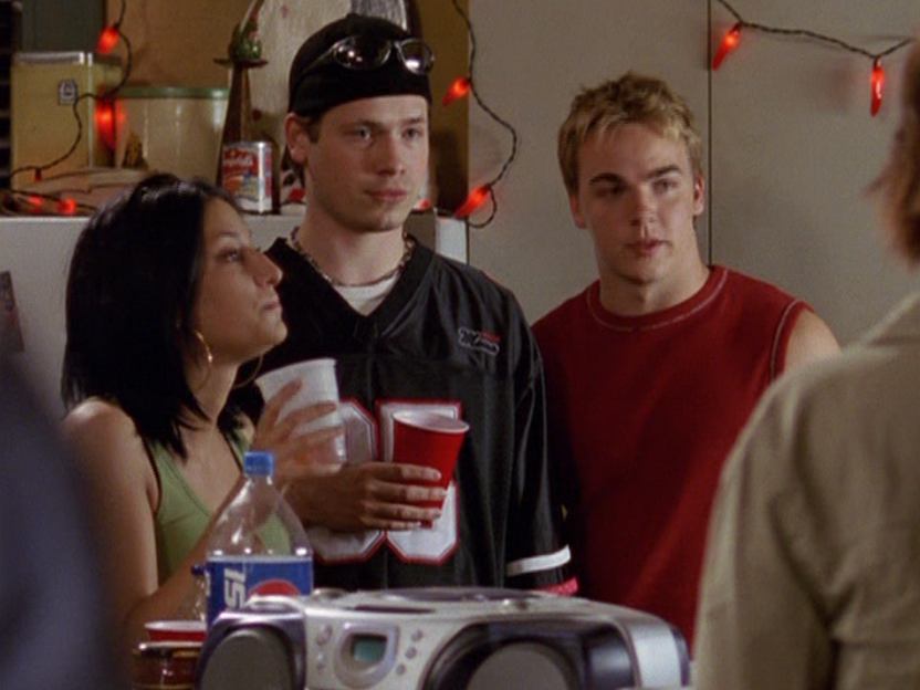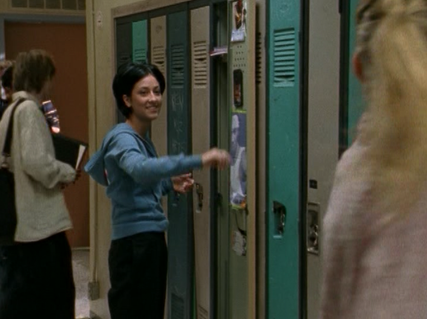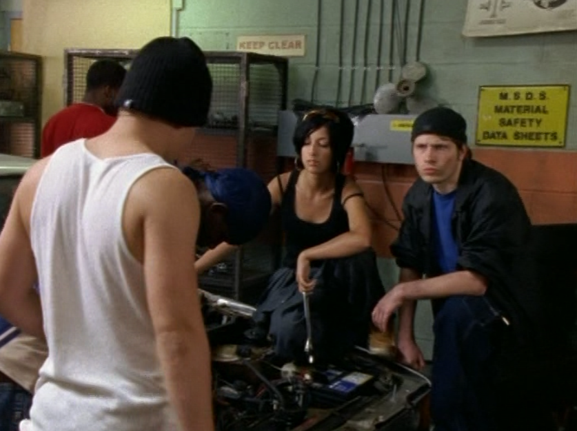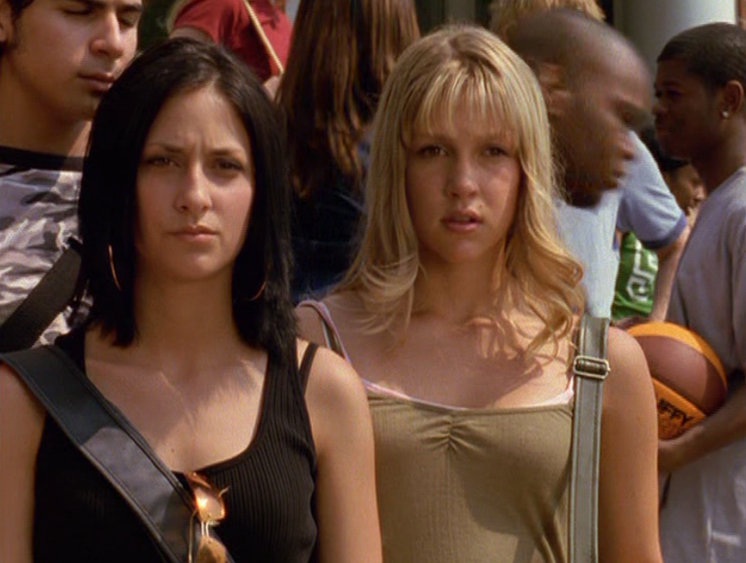A new episode, and we start off featuring scary, scary Alex. Her hair is jet-black as ever. First we see some casual khakis, with a black tank and of course those exposed bra straps. Ohh man look at these nails! Square-shaped French manicure. She wears her giant hoops, and her tinted shades tucked into her grey fitted tee. We get a brief moment of color here with this green tank and jeans, but then it’s on to this awful brown movie theatre uniform. Gotta hand it to her for adding so much personality to it, though, with the giant hoops.