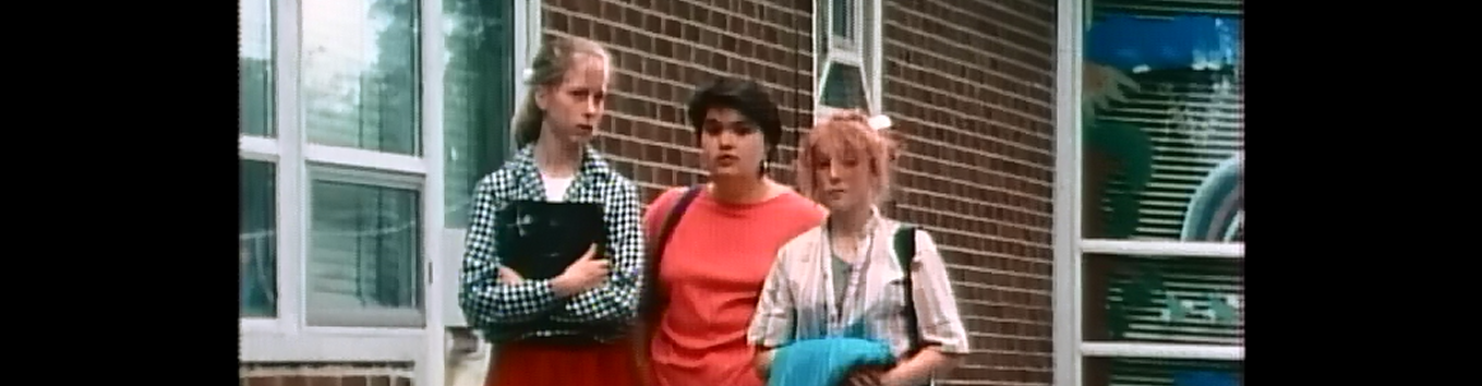 You guys, we have arrived at one of the most legendary episodes of Degrassi history – the thong episode. But before we dive in to the whale’s tail, we have to review other people’s fashion. Here is Angie, wearing pigtails and a blue and yellow top.