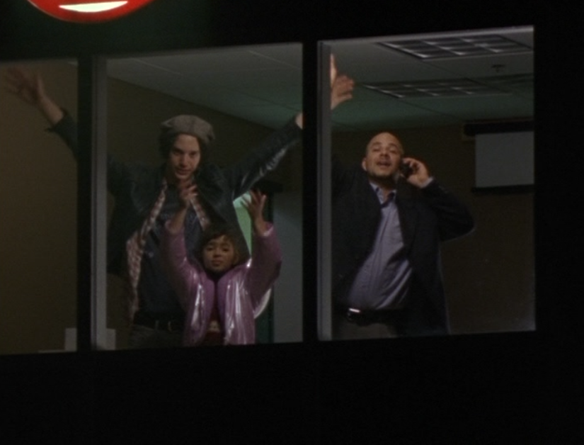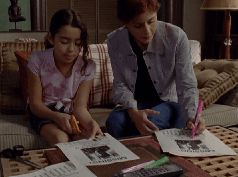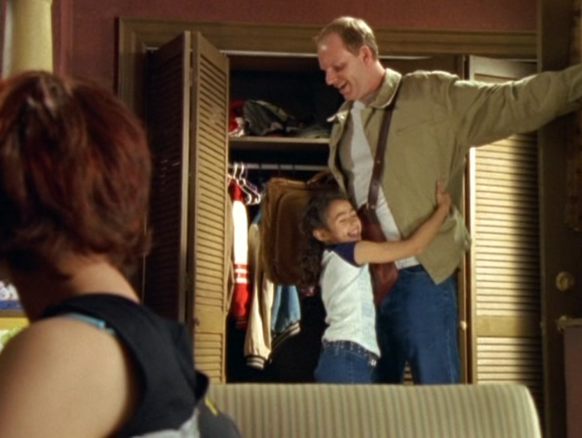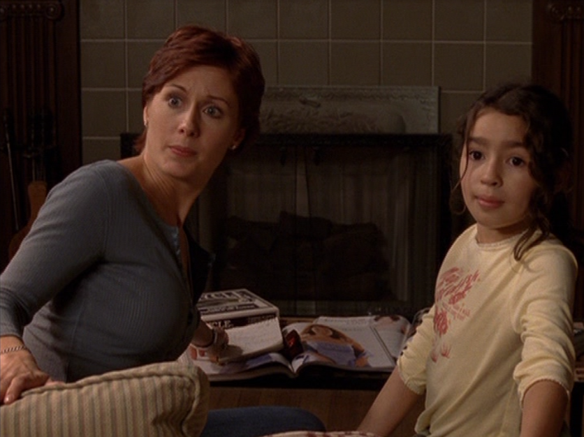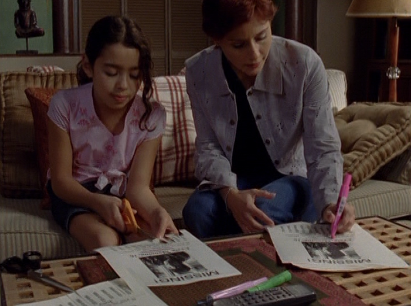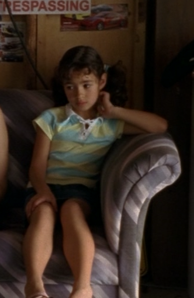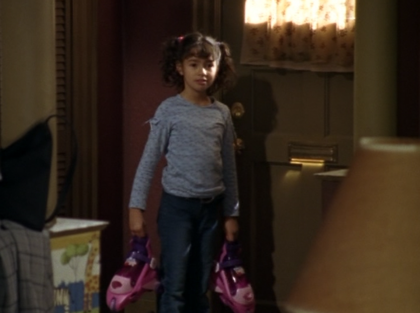 Angie thankfully isn’t a part of the goingson in this tragic episode, but looks like they are letting her watch the news on it. She is looking kind of old by now, though! She wears a tank, jeans, and tennies.