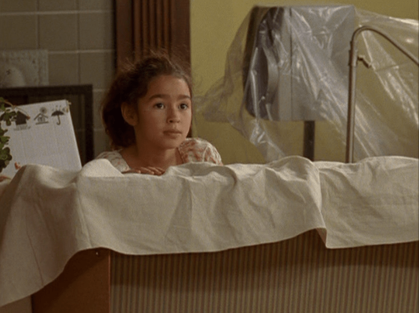 Angie looks bored to death while the grown ups paint the house. Oh yeah but she’s also going through trauma watching her brother spiral. She wears a square-neck, puff sleeve blouse with some khakis.