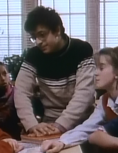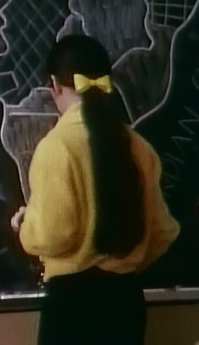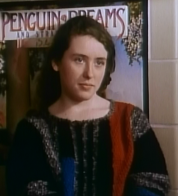 With her staple white turtleneck, Kathleen wears a pink v-neck button down cardigan and a white headband. For some reason I just really don’t think pink suits her personality.