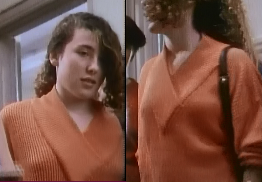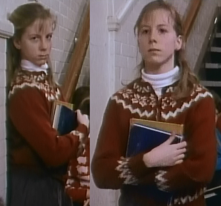 LOL @ Kathleen’s face. I like the white turtleneck under this red zip up sweater with snowflakes. Really nostalgic.