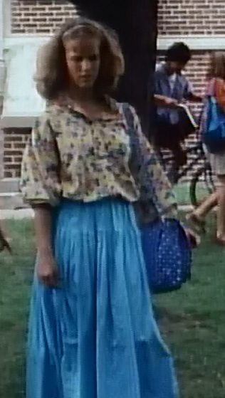 Steph returns to her disguise as an unsexy chick: Oversized button down yellow shirt with a floral pattern, and the long blue skirt we saw her wear in the first scene. She has also tried to tame her mane. Even though this isn’t as exciting as her school clothes, I enjoy the relaxed yet feminine look. And as we know, floral is totally back!