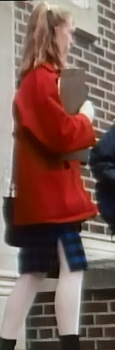 Susie’s printed skirt is actually pretty cool, and I like it with the grey tights and red button down.