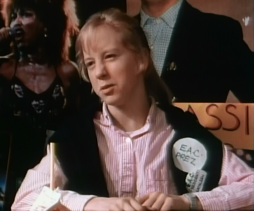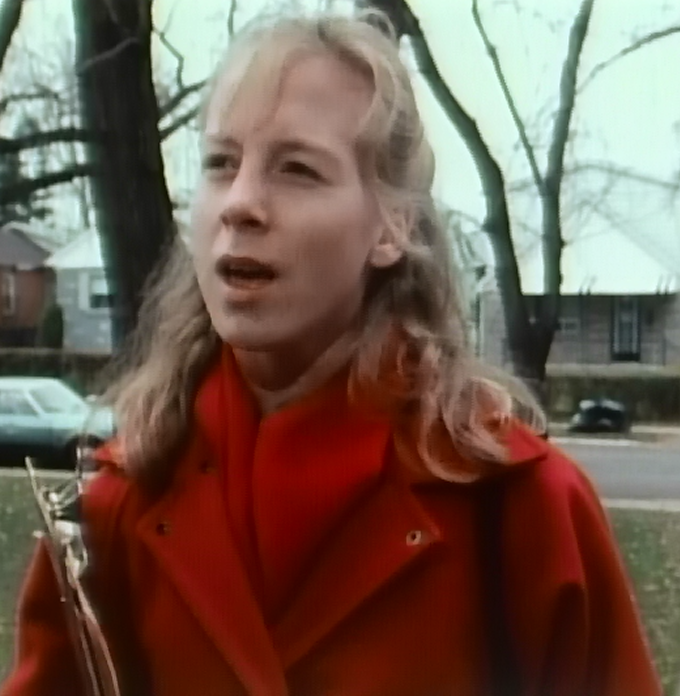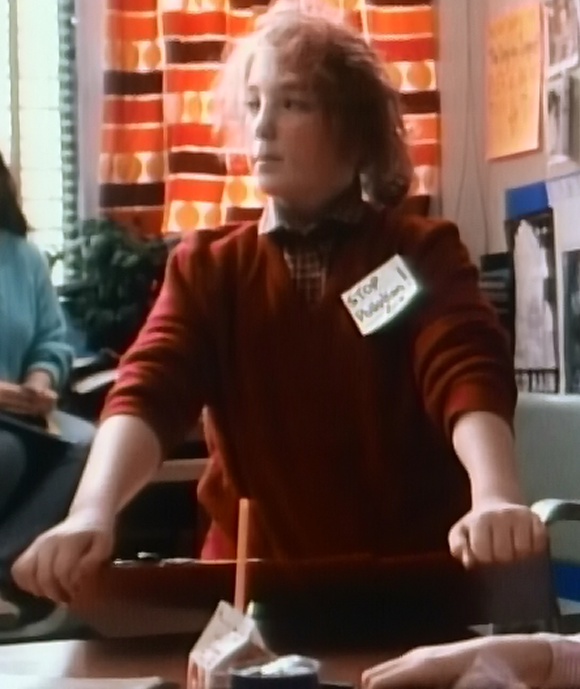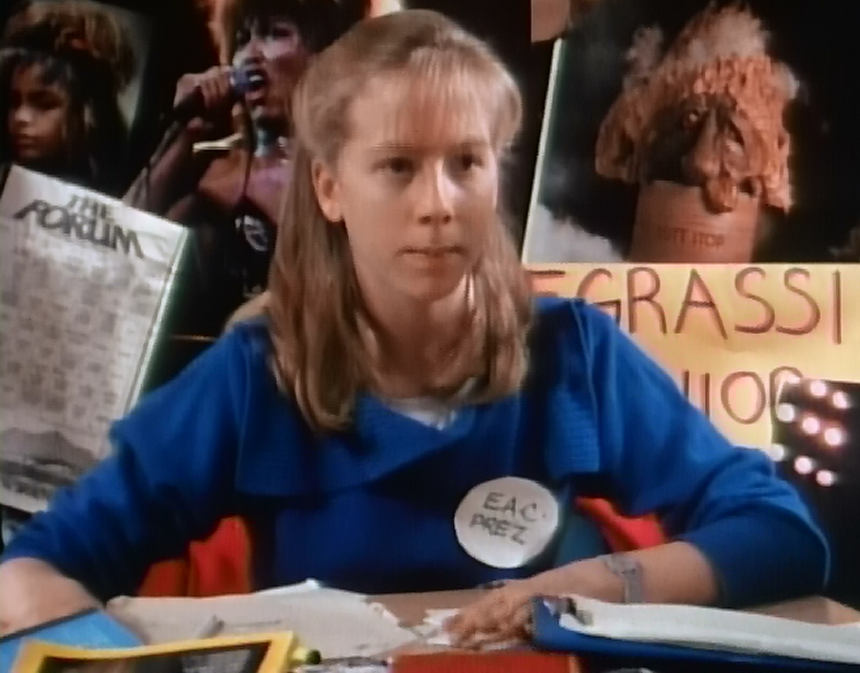 Kathleen’s dark blue sweater appears to have an ascot-style collar. And that’s about as interesting as her outfits get. However, you gotta respect the simplicity that reflects her total squareness. (Although…. in high school she has a few not-so-square moments…)