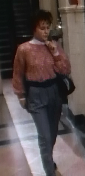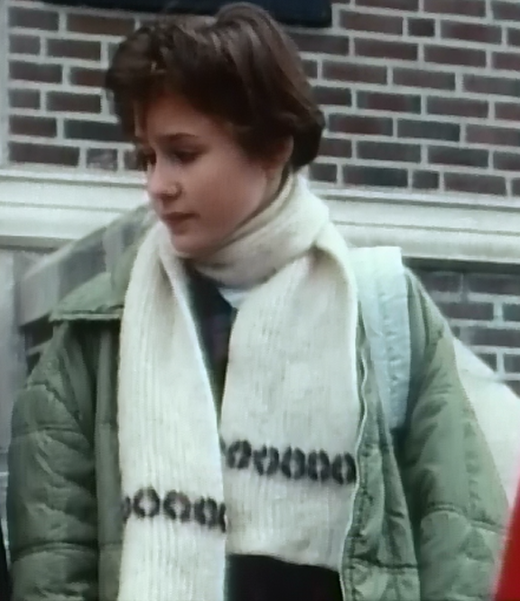 I kind of miss the classic scarves and the original way to wear them. In the South though, our scarves are really only decorative. We see her wear the same pale green puffer jacket a couple of times. In the second photo, she’s got a LOT of layers under it, with a cool colorful scarf – and let’s not forget the headband!