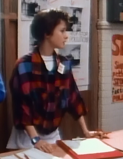 Colorful checkered shirt over a big white T. And I think I spy a headband!