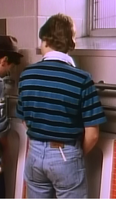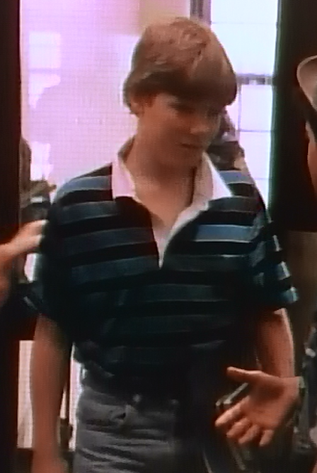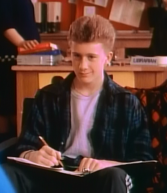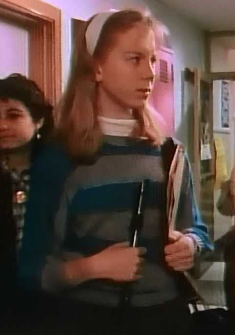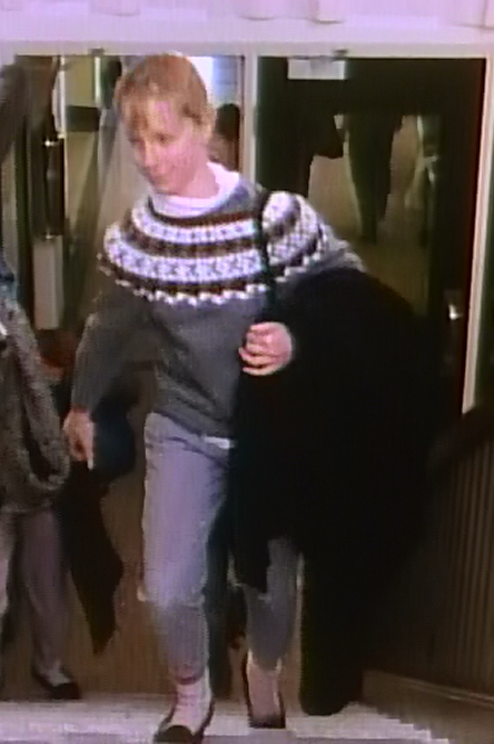 Day 2 of Spike’s crappy life. She wears a red-brown cardigan over a white cowlneck sweater, …socks over pants again!?.. red-brown socks over her black tapered pants, and these awesome black pointy shoes I can’t quite make out.