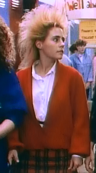 Spike is a little toned-down in this taupe textured sweater. But you may notice she is doing that cool 80s-one-dangly-earring thing!