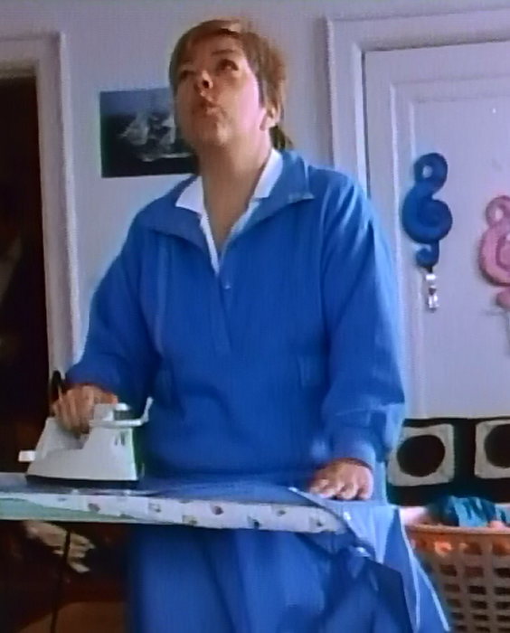 Ms. Wheeler sings opera while ironing in her loungewear – a sharp-looking blue sweatsuit… that has probably also been ironed.