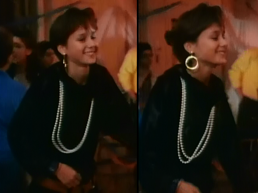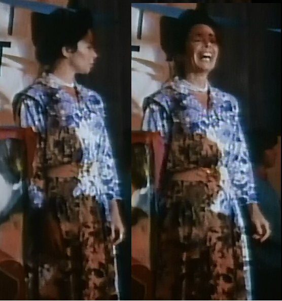 Once again in this extremely dimly-lit dance, we see a glimpse of Ms. Avery in a shoulder-padded, floor length blue floral dress matched with a belt, pearls, and an updo. Keepin it tacky, but keepin it classy.