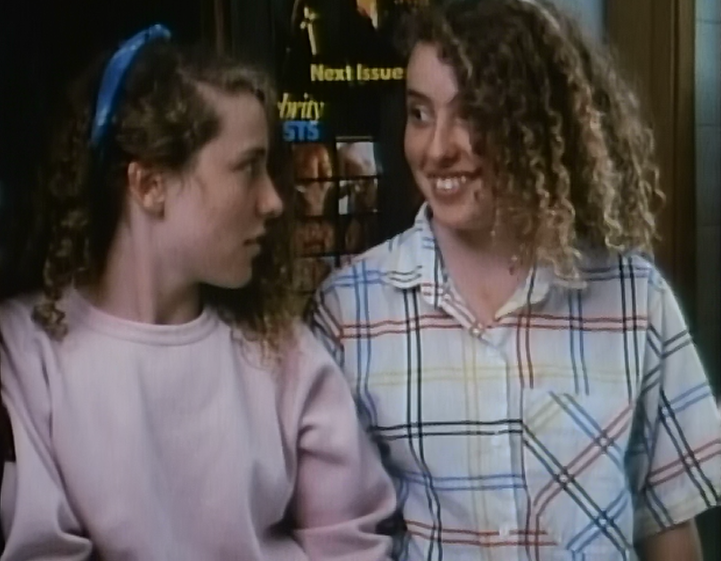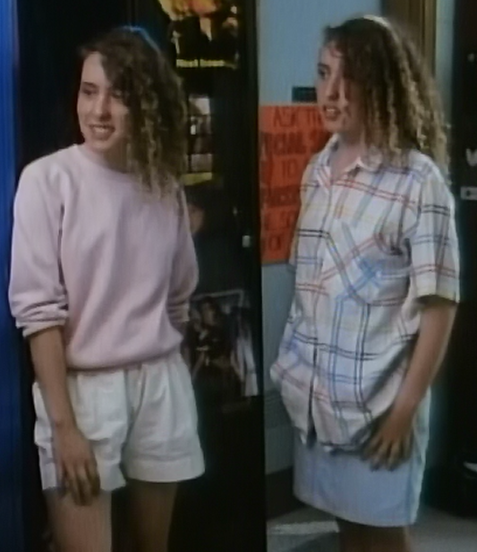 Liz (or “pre-Liz”) wears a black turtleneck under an oversized pink or red sweater/sweatshirt. Wait, what is she doing at a dance??