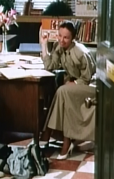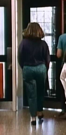 Yay, it’s Diana again! This was a brief moment while the camera panned watching students approaching the school. I loved Diana’s ensemble and this was the best cap I could get. She’s got a chic high ponytail, a white button down with a popped collar, high-rise belted grey slacks, and a black jacket. I love Diana’s curvy figure, and she really dresses it well.