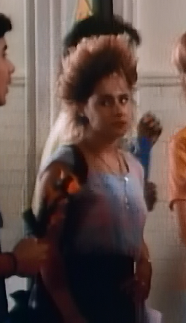 Alright, she’s back at it, wearing RED, the color of mad, passionate, true love. She’s not playing around in this red tube top, yellow miniskirt, red belt, colorful chunky necklace, pearl earrings, and red high heels.