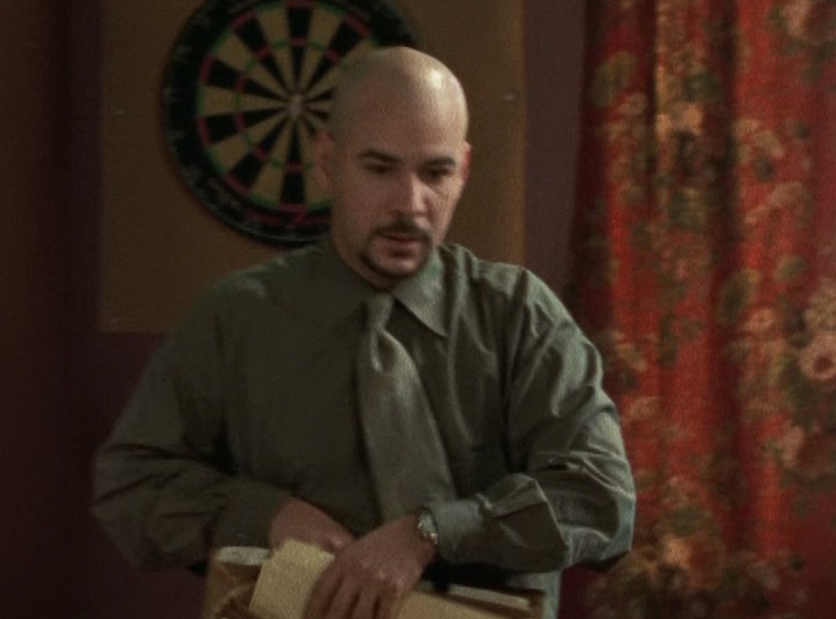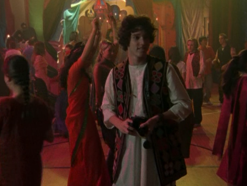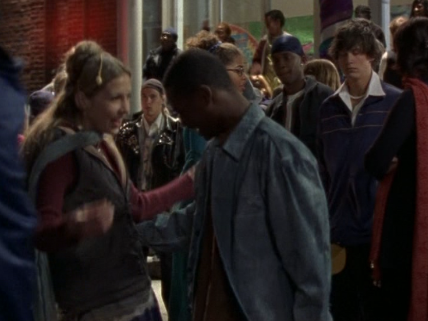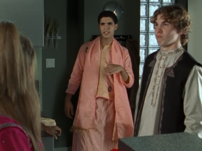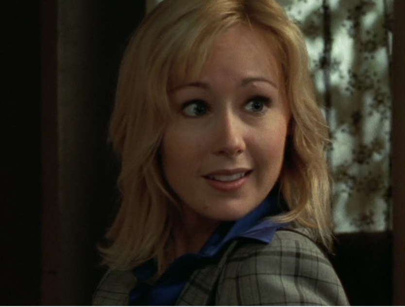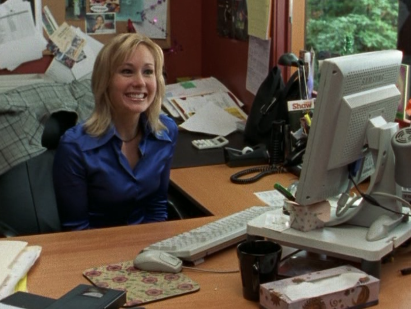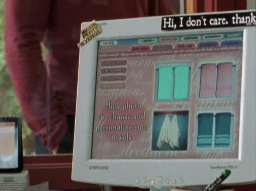 Wow, we’re at the end of season 3 already! Okay, I may finish this project one day after all! So in this finale, we get a lot of Caitlin. Oh lord, I feel SO bad for her sometimes. Caitlin really can break my heart, when her heart is broken (or about to be broken). So in this episode, Caitlin is once again, for the 50th time, trying to choose between her future and Joey. She finally decides she will resign to a life of Joey, wearing a shiny silky button down. I remember those shirts. I know just how it feels to wear one. Anyway, look at her little happy face sitting at her computer thinking everything is just going to be great? I feel so bad. Oh yeah, this has another 70s oversized collar that she wears with like, a plaid blazer or something. I also thought I’d snap a shot of the personalized hand towels she’s shopping for, because that’s kind of fashion too, right? Also, get a load of that 2000s sarcastic catch phrase sticker on her computer. Well, by the end here, she has reluctantly decided to choose her well-being INSTEAD of Joey, so she’s pictured in a trench coat, getting ready to set off, leaving Joey to awkwardly face cry.