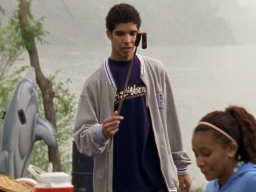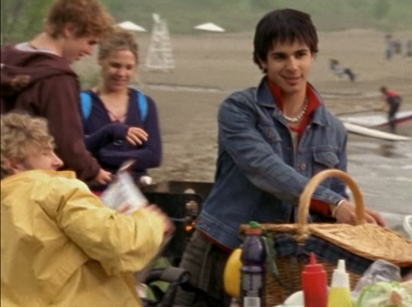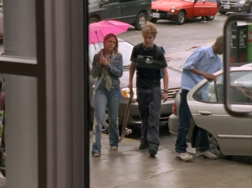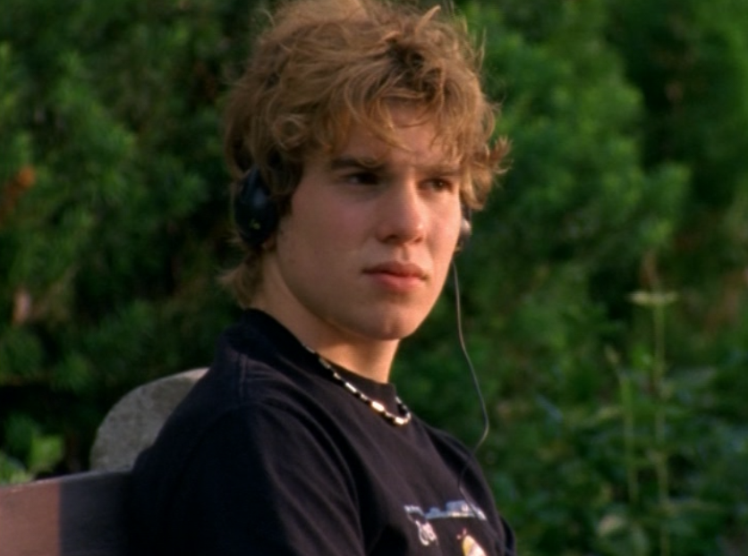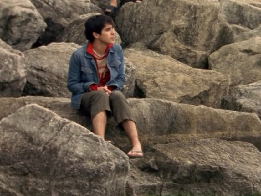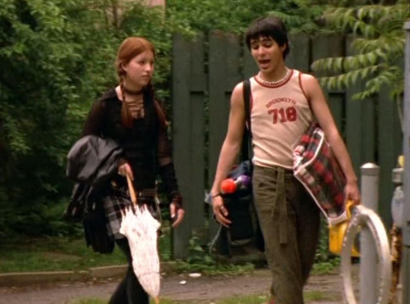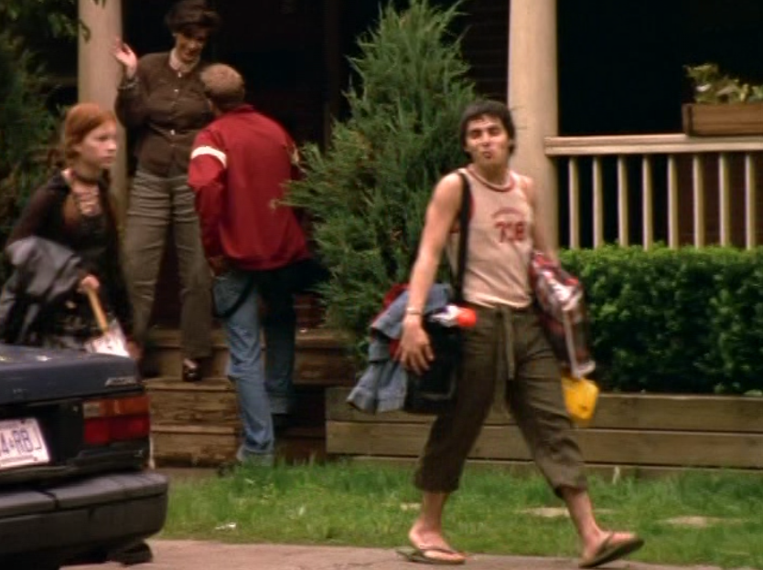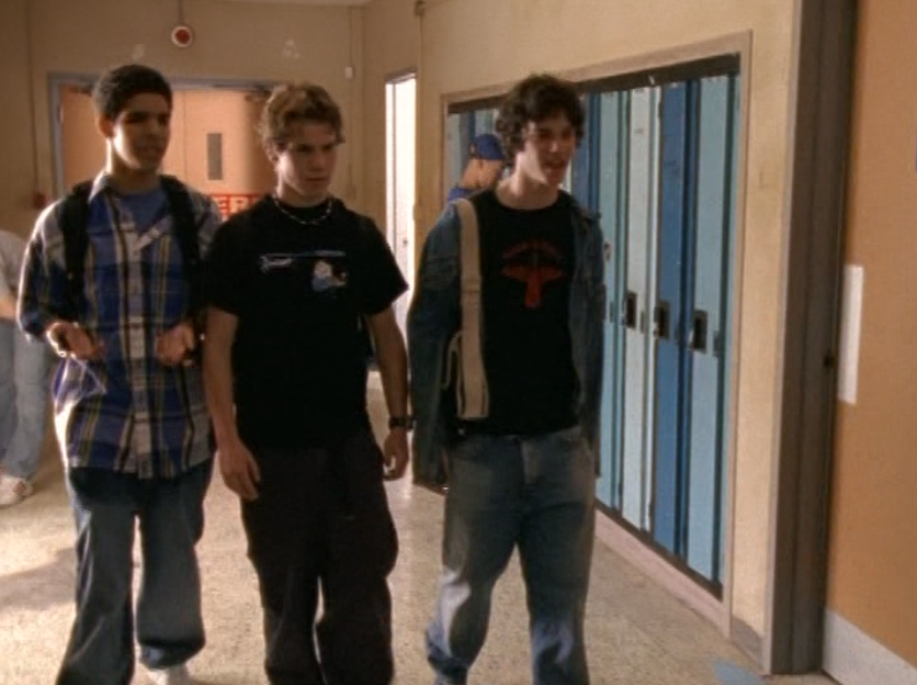 At the beach, Spinner wears a tee, a necklace, sandals, and swim trunks. Also love the googles and the water gun. Oh yeah, and he adds a brown zip up hoodie. Back at school he wears baggy pants and a tee. I also want to note a couple of things – the belt. Can you see it? Remember those black belts that you used to let hang straight down like that? It was kind of a skater thing. I used to LOOOOVE wearing my belt like that, I thought it made me so cool. I also would like to note those headphones, the kind that go behind the head instead of over the head. These were also incredibly cool.