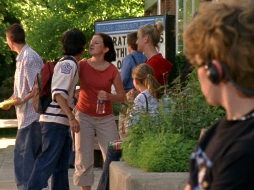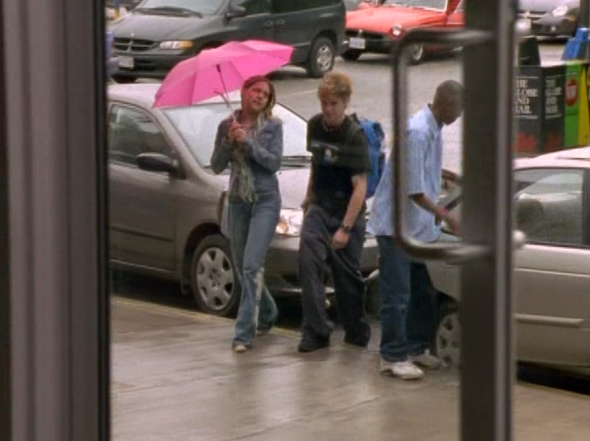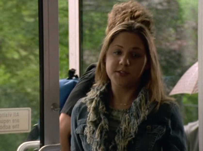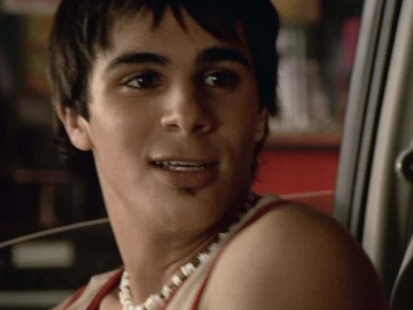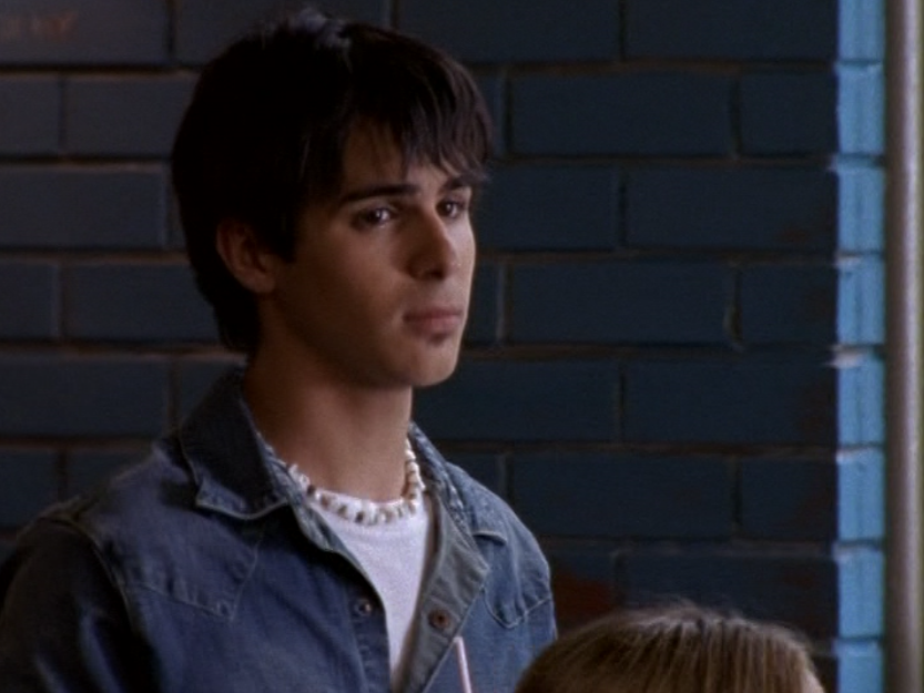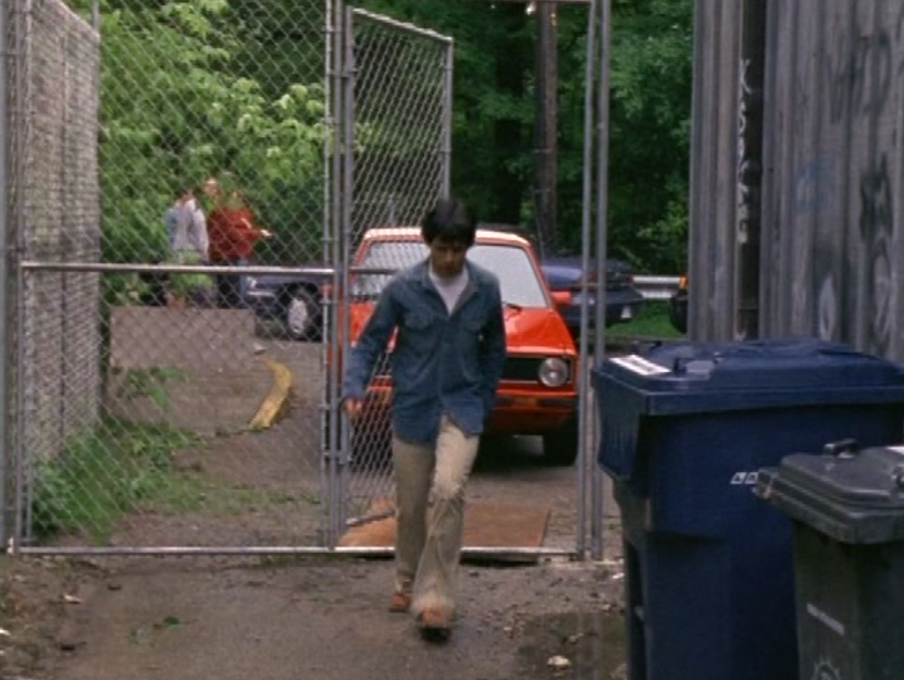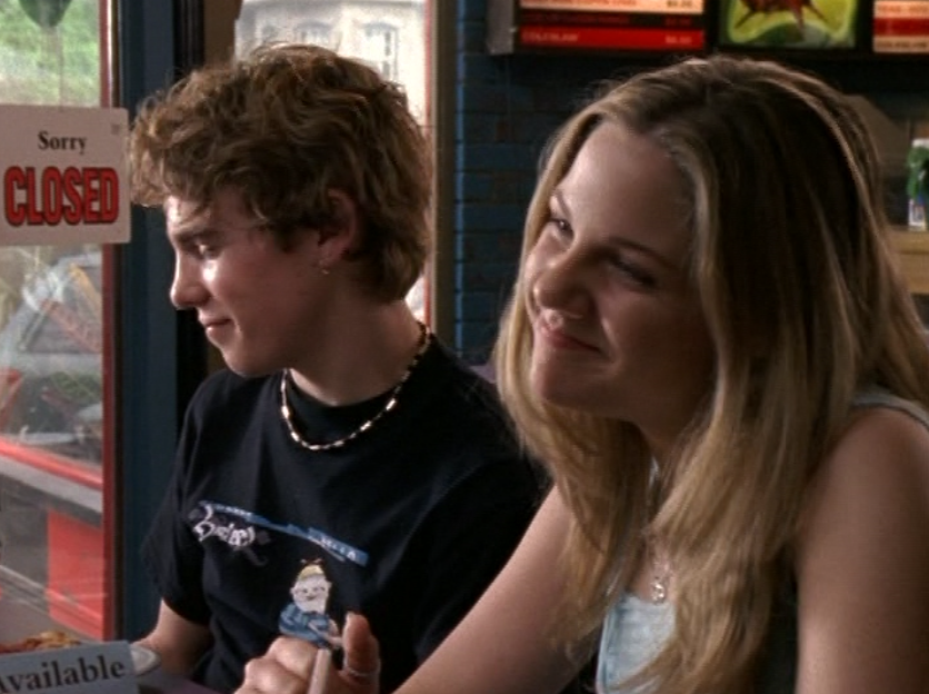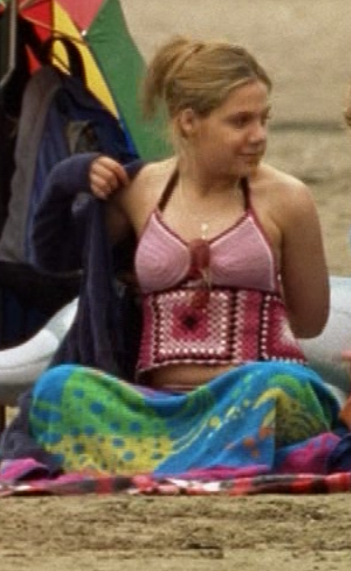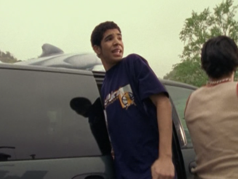 At the beach, Spinner wears a tee, a necklace, sandals, and swim trunks. Also love the googles and the water gun. Oh yeah, and he adds a brown zip up hoodie. Back at school he wears baggy pants and a tee. I also want to note a couple of things – the belt. Can you see it? Remember those black belts that you used to let hang straight down like that? It was kind of a skater thing. I used to LOOOOVE wearing my belt like that, I thought it made me so cool. I also would like to note those headphones, the kind that go behind the head instead of over the head. These were also incredibly cool.
