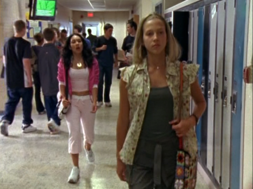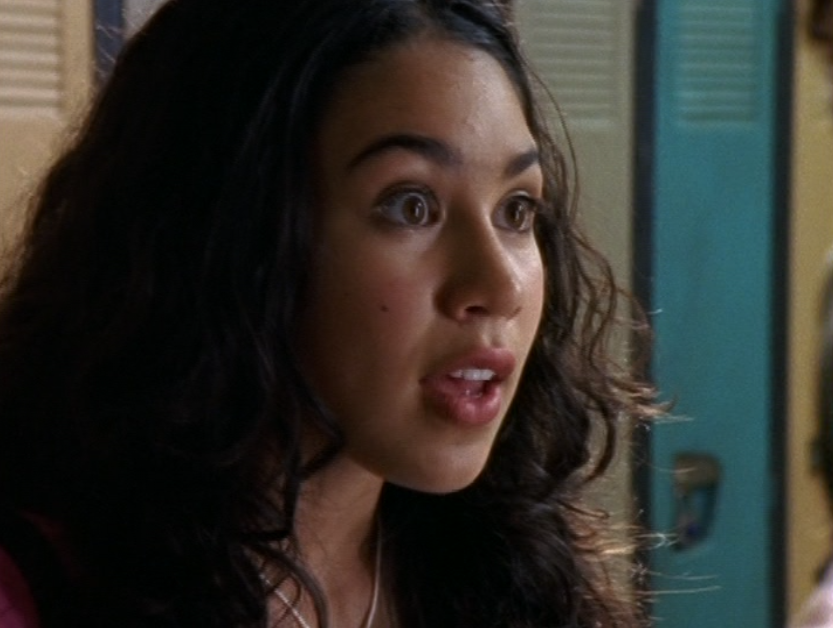 This is it, folks. Another absolutely iconic Manny fashion episode. Second only to the first appearance of the thong I’d say. She’s on a MISSION you guys – to SEDUCE Craig into loving her. Somehow it worked, for a while, too. First she’s wearing this skin-tight athletic-inspired tee, with low-rise casual khakis. Her hair is so curly and lovely. Let’s move on. The RAVE. The CLUB outfit. Carefully curated by Manny on a mission. First is this pink and yellow crop top with flared sleeves. Then, this immaculate pink thong emerging from her low-rise super-tight jeans. And then hoop earrings, the hoopiest hoops ever. Also, super big hair. It’s really a shame that we don’t get a full view of this ensemble. And finally, we are back at school and Manny is wearing all pink – a light pink athletic set with a satin track jacket and white shoes. And she has a big blowout with Emma that somehow invisibly resolves itself.