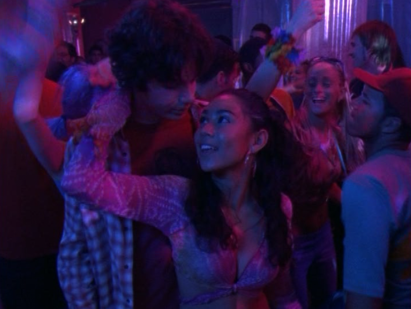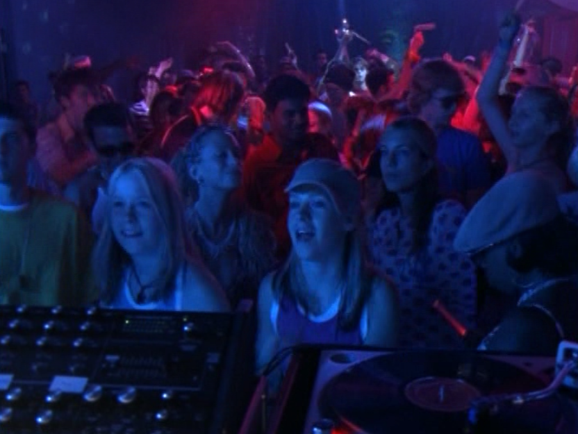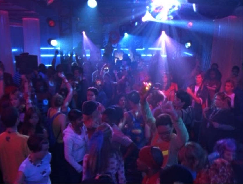 Here are a few miscellaneous shots from the rave, although you can’t really discern anyone’s fashion choices in this blob of people. However, I did think this girl in the background behind Chris and Emma showed a great demonstration of 2000s stylings – low rise flares, a crop top, and bellybutton ring. Complete with that super flat stomach that in actuality is rarely humanly possible.