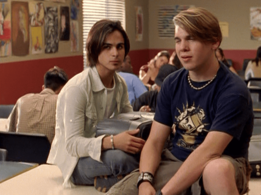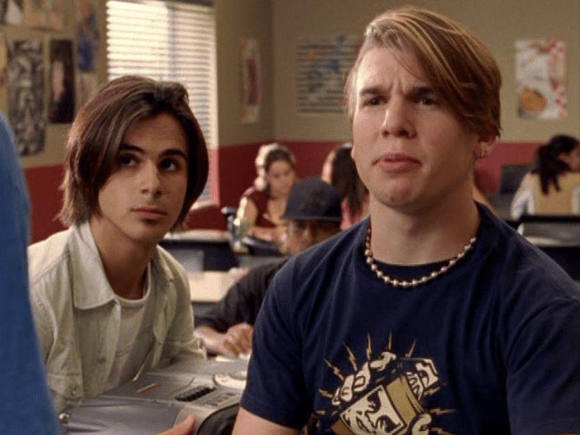 I LOVE Manny in yellow! It’s a shame we don’t get to see that more. She wears this all yellow tracksuit, dangerously low rise as always, and a brown tee. Her hair is long, straight, and parted down the middle. She also sports a dark purple messenger bag. It’s a shame no one else wears these 2000s track suits on Degrassi! But, I didn’t have one, that’s for sure. They were kind of an edgy thing to wear, tbh.