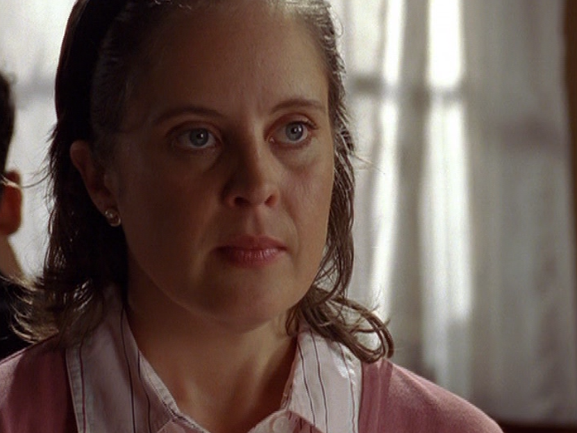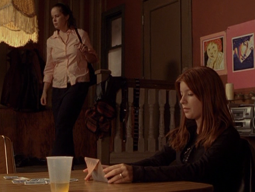 Ya know, I always think of Queen of Hearts as the Ellie + Alex episode, but it’s also quite big on Paige. I love how she looks in S4 – her hair, her grungy eye makeup. First she wears this tiny tee with a chihuahua on it. It looks like its name is “Chichi” lol. Next she’s at the movies with Matt. She wears casual flare cargo khakis, and ulta-low yellow cowl neck over a white shirt, and a random pink cowboy hat, which I kinda love. But in all actuality this outfit is pretty much awful. I mean, look at the size of those pockets on the khakis. Was she using those pants to smuggle food into the theatre? I guess, cuz ain’t nothing fitting into that mini purse. The next outfit, I love. It’s this gorgeous white off-shoulder top with flowers on it. Also, low rise janes and some kinda statement belt as per the 2000s requirements. And lastly, Paige wears her brown, scratchy work uniform and sneaks in a call on her flip phone.