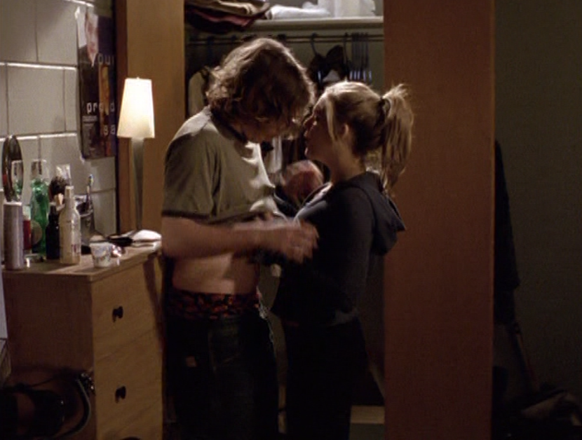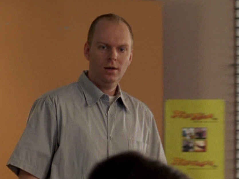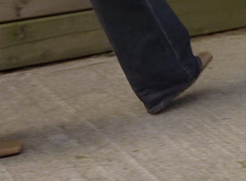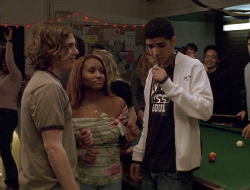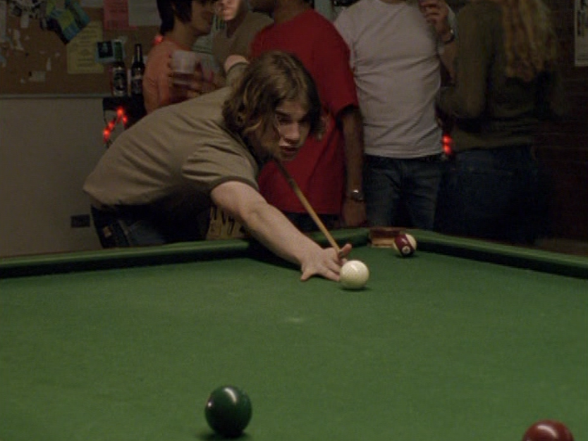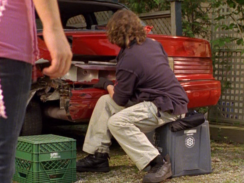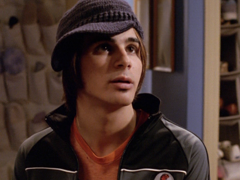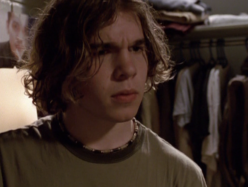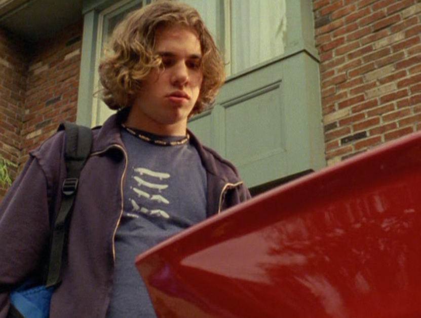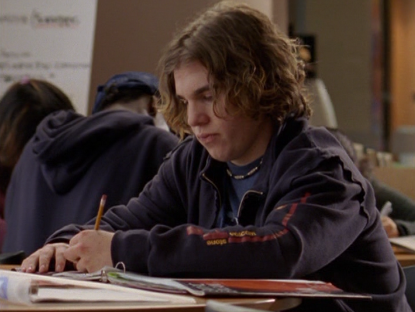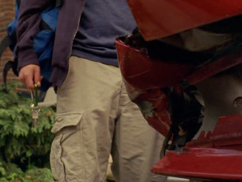 Spinner is turning into a total douche bit by bit. First he’s wearing a brown ringer tee, baggy pants, and skate shoes. His hair just lookin’ a mess. Oh yeah, I also got a shot of those like, boxers hanging up over the pants. Do people still do that? The next school day, he’s got on khaki cargos, his skateboarding shirt, and a zip up hoodie.