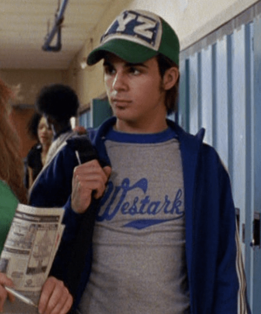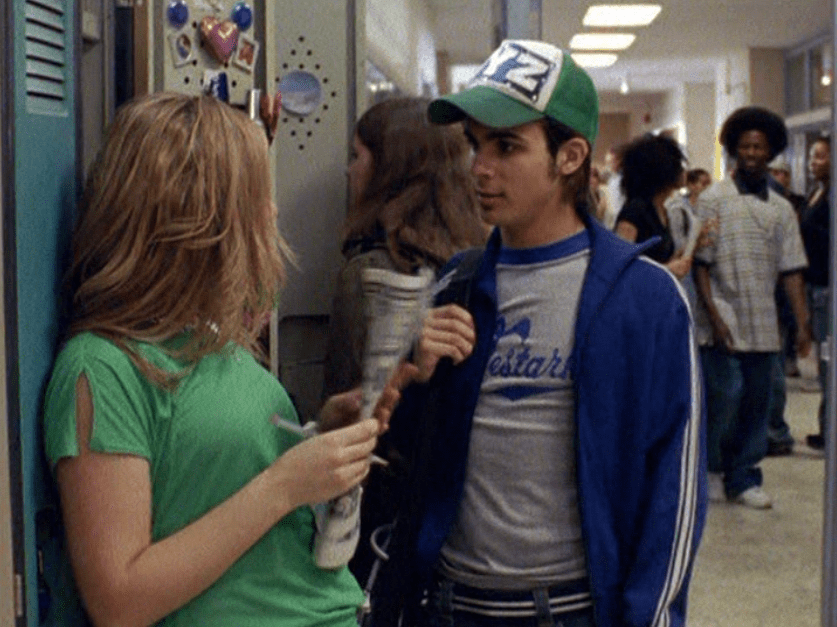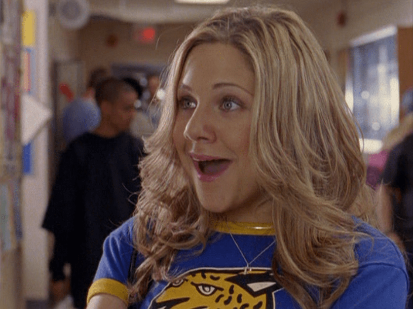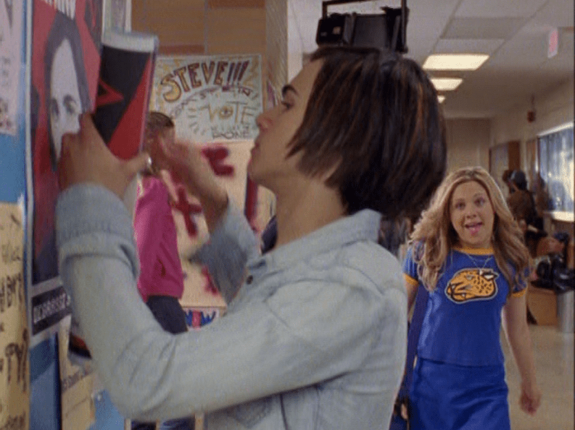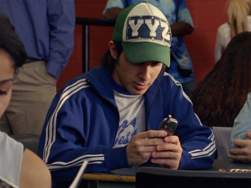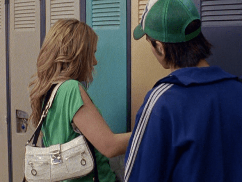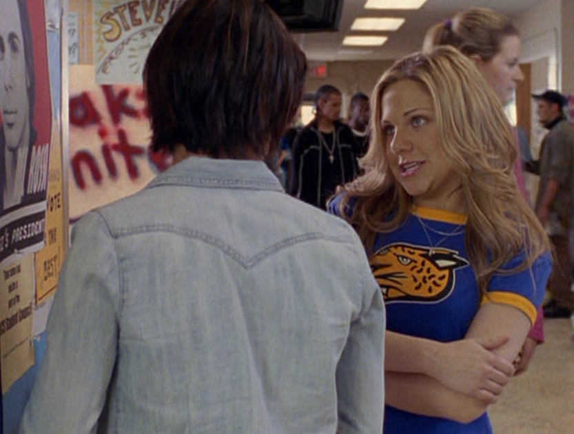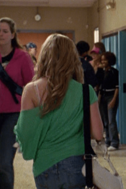 Paige is looking for a job to pay back Spinner after she wrecked his car. She’s wearing kelly green, which is very different for her! This shirt has that very 2000s silhoutte – big in the sleeves and shoulders and then tight fitting around the hips. What even was that? I definitely wore that style as well. Anyway, it’s hanging off one shoulder and exposing the bra strap – cue “exposed bra strap” tag here on the blog. I also wanted to mention that tiny 2000s purse. Did anyone else carry around a purse AND a school bag like Paige? I totally did. Her hair has been textured and styled really nicely lately. I dig it. And the final outfit is her spirit squad uniform.