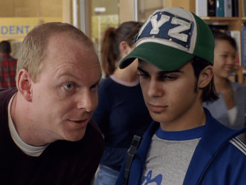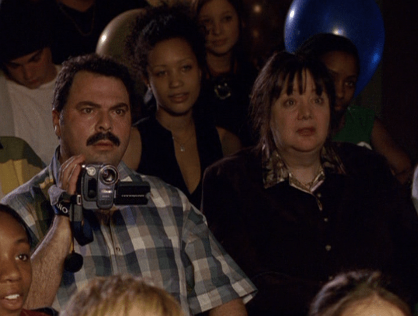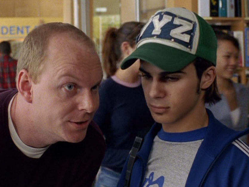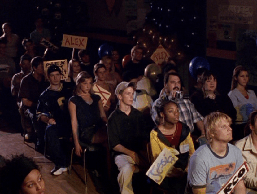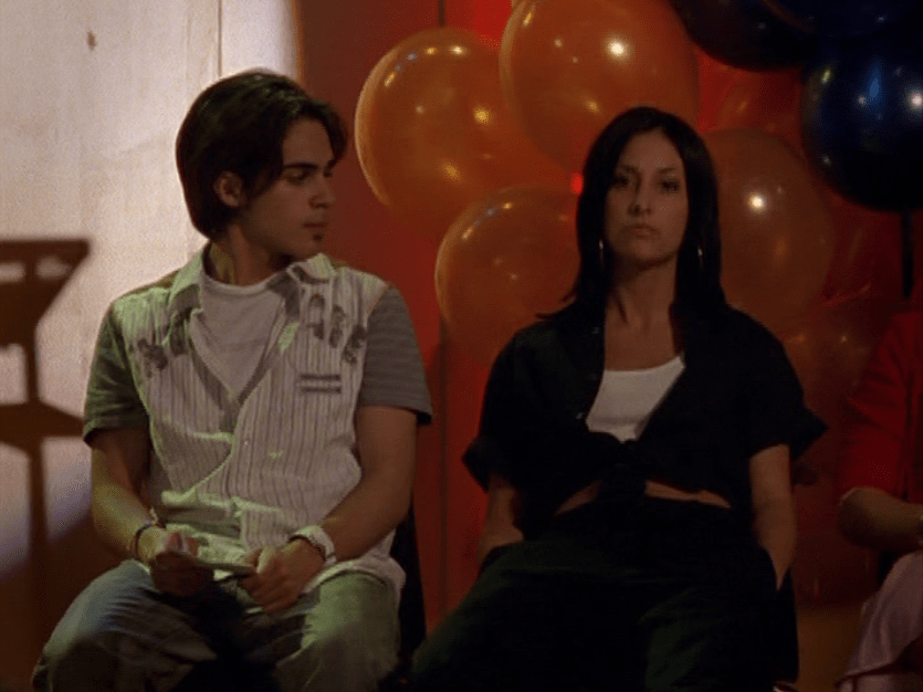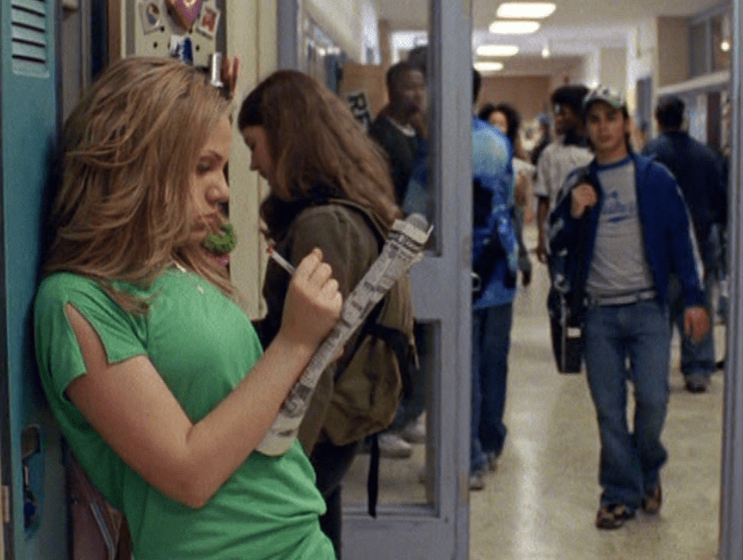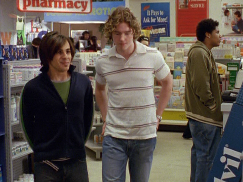 Paige is looking for a job to pay back Spinner after she wrecked his car. She’s wearing kelly green, which is very different for her! This shirt has that very 2000s silhoutte – big in the sleeves and shoulders and then tight fitting around the hips. What even was that? I definitely wore that style as well. Anyway, it’s hanging off one shoulder and exposing the bra strap – cue “exposed bra strap” tag here on the blog. I also wanted to mention that tiny 2000s purse. Did anyone else carry around a purse AND a school bag like Paige? I totally did. Her hair has been textured and styled really nicely lately. I dig it. And the final outfit is her spirit squad uniform.
