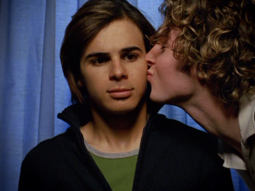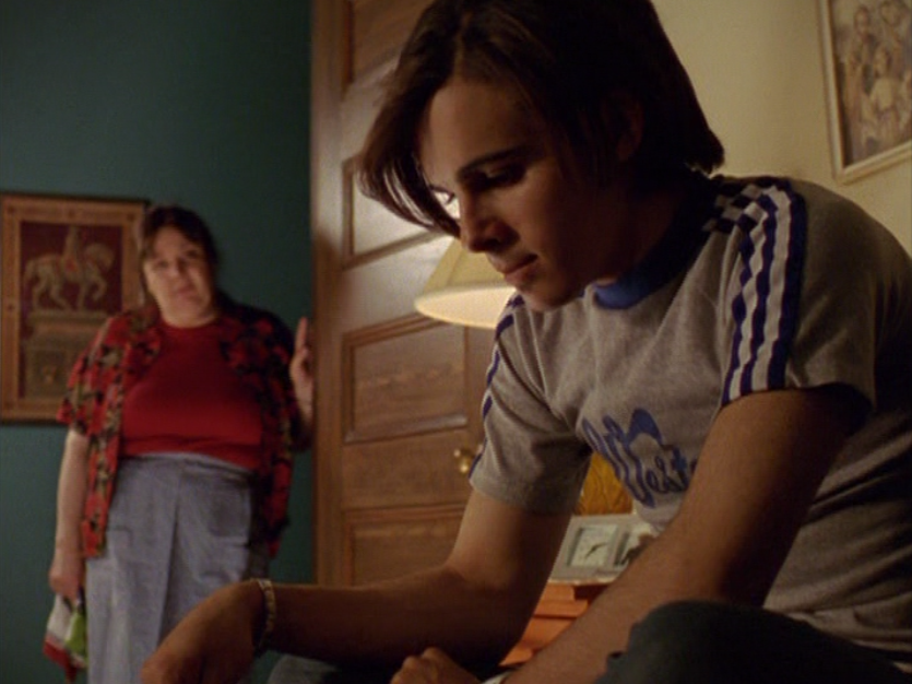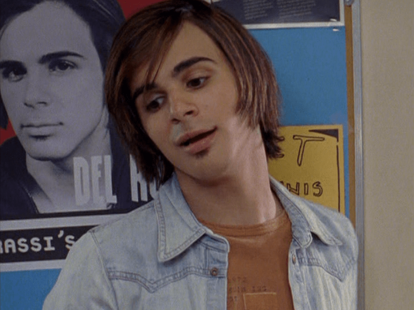 Tons of Marco for you today. First are his photobooth shots. His hair is all styled with a side part, and he wears a zip up sweater and a green tee, jeans, and a striped belt. Also, OMG one of those bracelets where you could swap out those plain silver segments for a segment with a charm on it. Wow. The next outfit is one that I would call a quintessential Marco look. He’s got these flared jeans on, an athletic-looking jacket, and his YYZ hat. Oh lord, after all these years I just googled YYZ hat. Turns out YYZ is the Toronto airport! That’s cool! Anyway, I really like this outfit. Think about how much better Marco dresses than, say, Spinner. Next he wears a very light wash Western-looking jean jacket with an orange tee and jeans. And finally, for the presidential debate, he wears his hair all slicked back, aww. He also wears, idk how to describe this – it looks like a soccer-inspired shirt, but I don’t know why I’m inclined to say that.