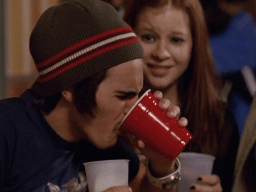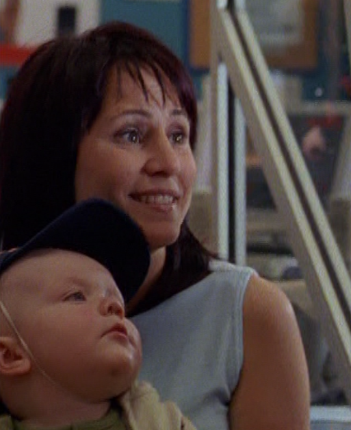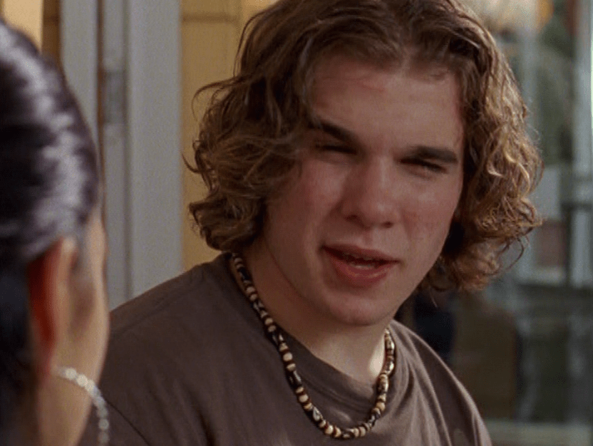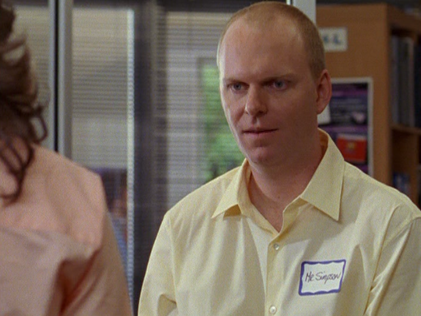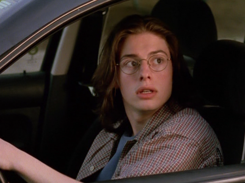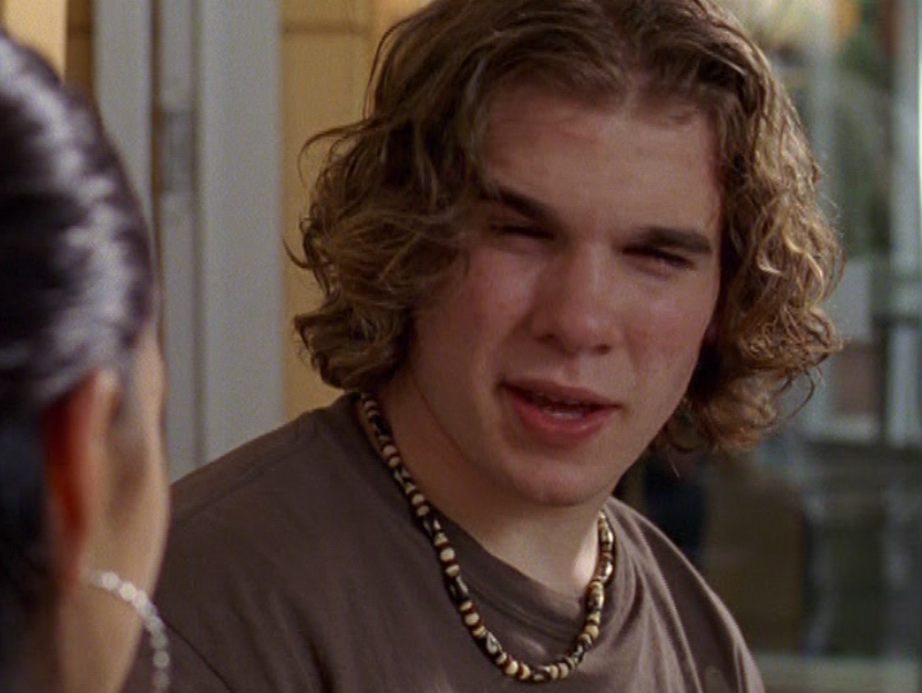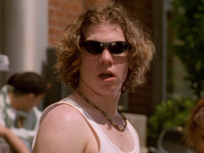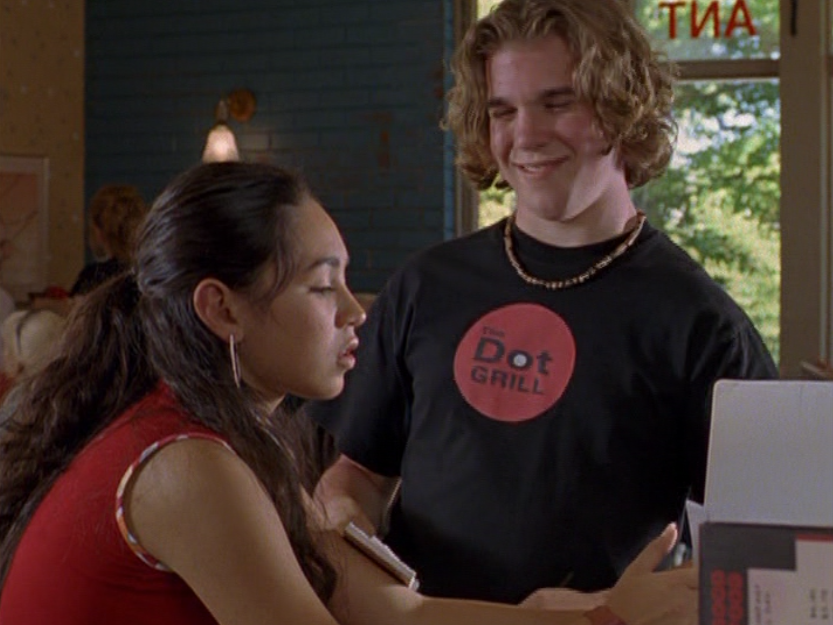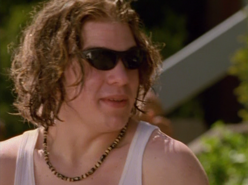 Ew, it’s gross Spinner time. Spinner in his grossest form, I mean. I try not to get screenshots that have the credits showing but it’s all I could get for this first ‘fit, as unremarkable as it is. A brown tee and carpenter jeans. Oh and a necklace. And that awful greasy lookin hair. Even worse, his pasty body is revealed in a white tank and what looks like a little kid’s sunglasses. lol. Sorry, I’m just being brutal for no reason. He does suck right now though. And finally, a little glimpse of him in his Dot uniform. They should really make him wear a hair net.