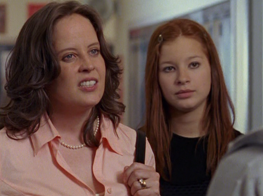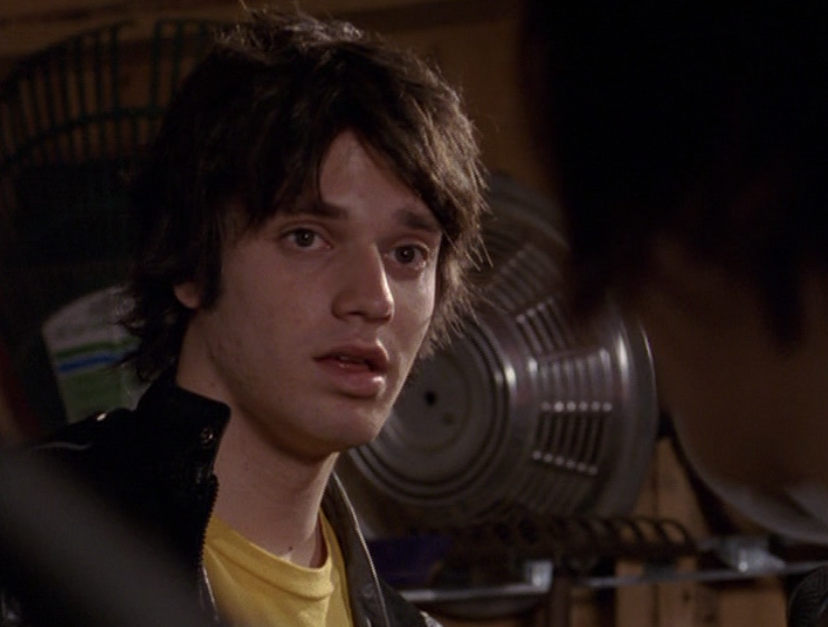 We gotta lotta Ellie to work through today! This is the episode where she decides to move out of her mom’s house. Because her mom is a drunk and almost burned the house down. So she “moves in” with Sean. Sadly it’s more like “crashes there for a while”. First we see her black flare jeans, grommet belt, and arm bands that she fell asleep in. She realizes it’s morning, and she scrambles to put in her leather jacket and grabs her Emily the Strange bag. She also has her hair in a middle part and clipped. At school, it looks like the had the chance to change clothes first because she’s now wearing a chain necklace, pinstripe pants, and a black studded shirt with armbands. She also has this twisty hairdo going on again. I’ve never actually seen this in the wild so I feel like the stylist was just experimenting or something. Looks like it took forever though. The next scene is Ellie in her PJs while the house is aflame. She wears a grey 3/4 sleeve shirt with classic PJ pants. And I must say, her hair looks amazing. The NEXT outfit is spectacular, a crative combo of pink with her blacks. She wears a chain necklace again, and this mesh shirt with pink striping deails. We can also see that triple-layer grommet belt she’s getting such good use out of, which she wears over a cargo-style skirt. Also, the knee high wedge boots can be seen really well here if you aren’t blinded by pasty naked Spinner! Ellie’s house party outfit here is a DREAM. I love this deep v and tons of corset tying up and down the front. Finally we wrap it up with a darling tank + off-shoulder mesh shirt combo. Gotta love Ellie’s wardrobe.