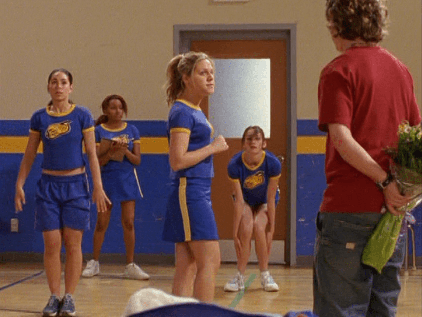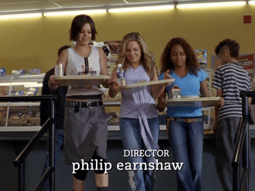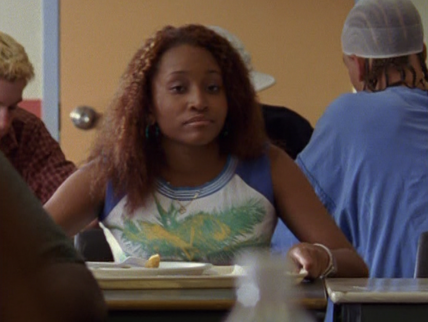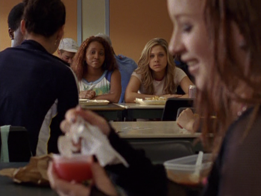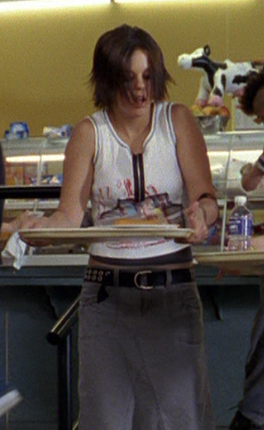 Hazel time! First she’s in the caf in a tight, blue, v-neck tee with flares and a colorful belt. Then she’s trying to talk sense into Paige, wearing a graphic tee and flares again. Oh, have we mentioned her hair? It’s currently red and curly and looks really cute. Next is a raglan style graphic tank – she sure is casual lately! And finally, a couple of spirit squad practice stills.