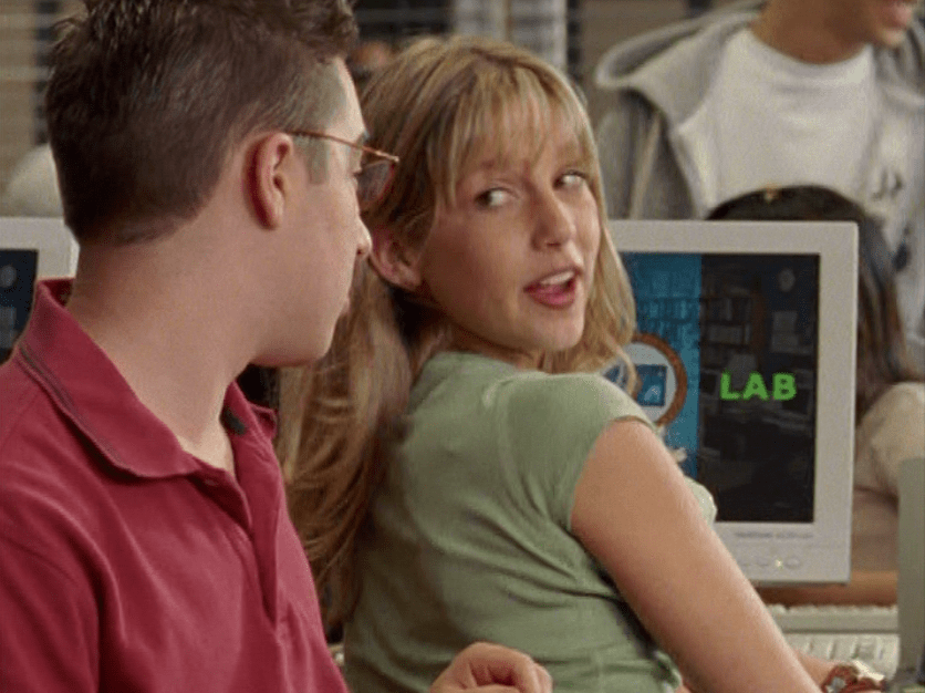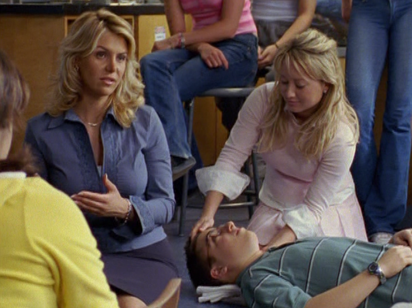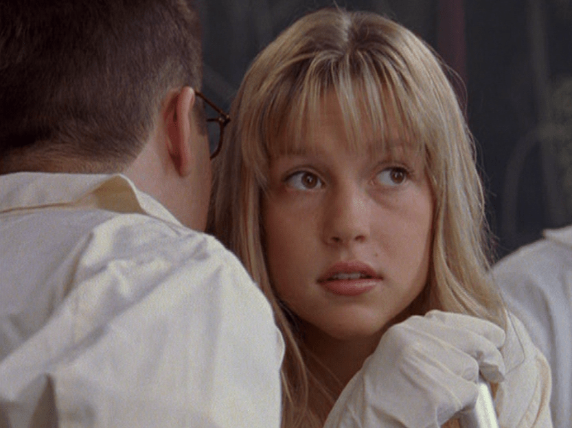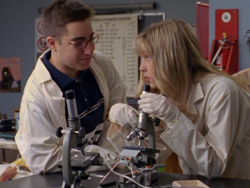 Emma is looking especially dead inside right now, and the shooting hasn’t even happened. She’s got those nice, long, thin 90s bangs, and wears an assortment of skin-tight t-shirts. Also, she’s seen in science in her lab coat, gloves, but no goggles which seems weird.