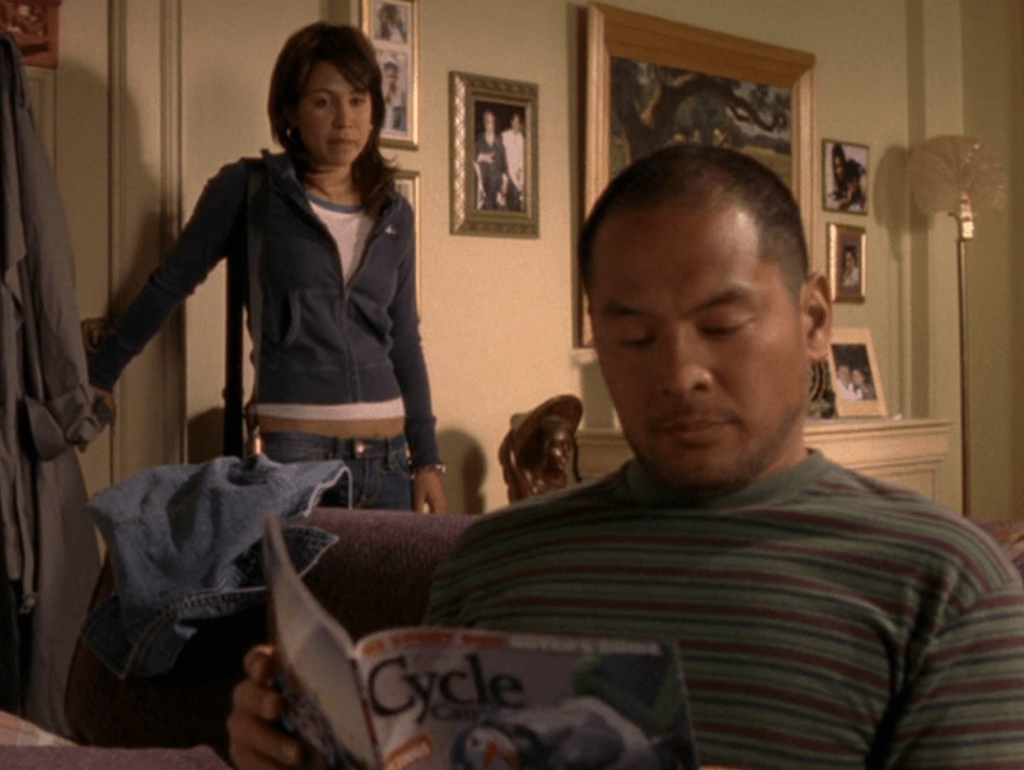 Something about seeing Manny’s mom out of the house, out from under the thumb of Joseph… she looks more empowered, more autonomous, like she does her own stuff out there in the world. She comes to see Manny at school, and it reminds me of when Michelle’s mom came to see her at school, and also Caitlin’s mom. Julietta wears cropped pants and a jacket. I can’t tell for sure but these might be her work clothes – lastly we see her wearing scrubs back at home.