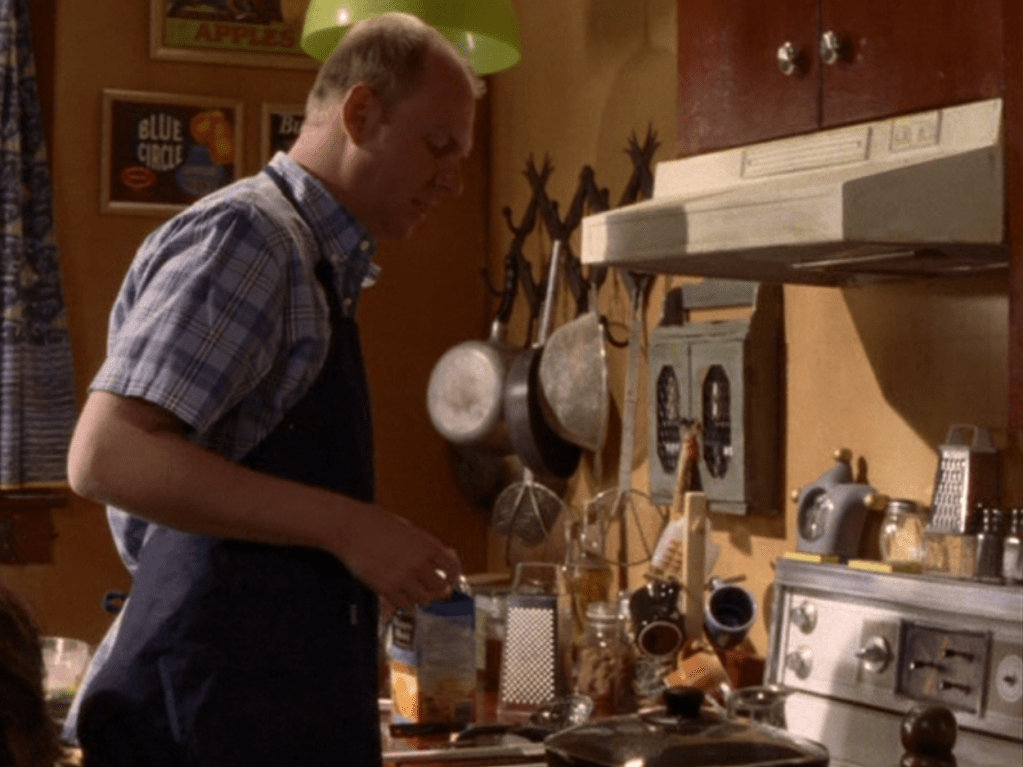 Oh great, it’s Manny’s awesome dad again. He’s dressed in a very out-of-place looking shirt. It’s probably meant to look like it came from Value Village, to again show how hardworking and frugal Joseph is. And, ya know, just to generally contrast with Manny wanting to be expressive with her appearance. Tension.