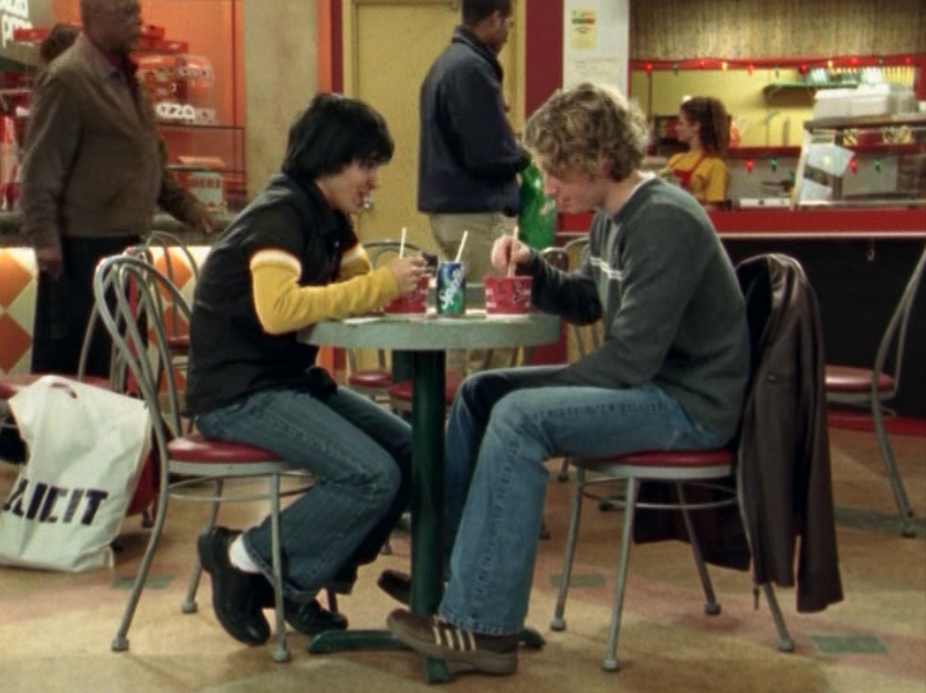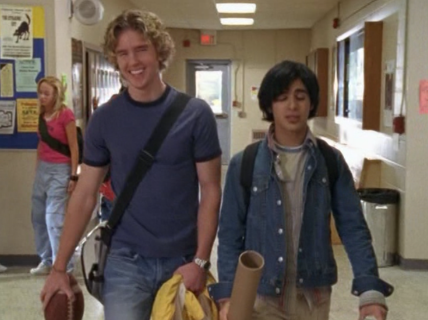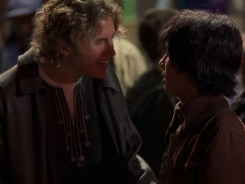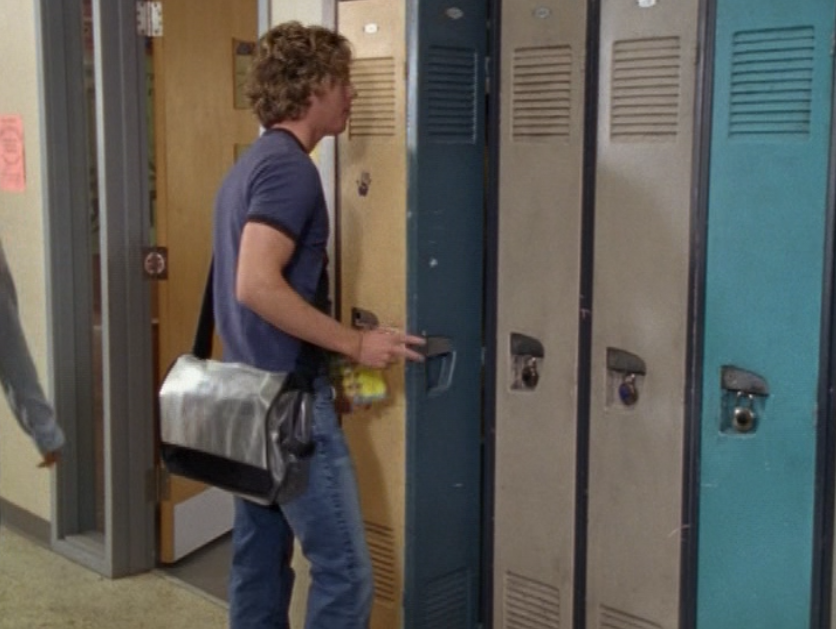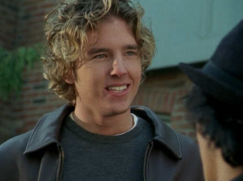 Ugh. This is where things get really disappointing. Dylan is in college now, and turns out he’s not such a fan of monogamy after all. Thing is, he failed to have a conversation with Marco about it. I remember in the preview for this episode, they showed Dylan in bed with this guy. Freakin earth-shattering! He’s got his hair big, he looks pretty athletic in this striped polo, and ugh he’s just sickening me at this party encouraging Marco to go get his own side piece. Hard to even talk about the fashion right now.