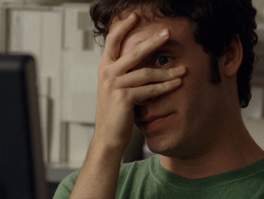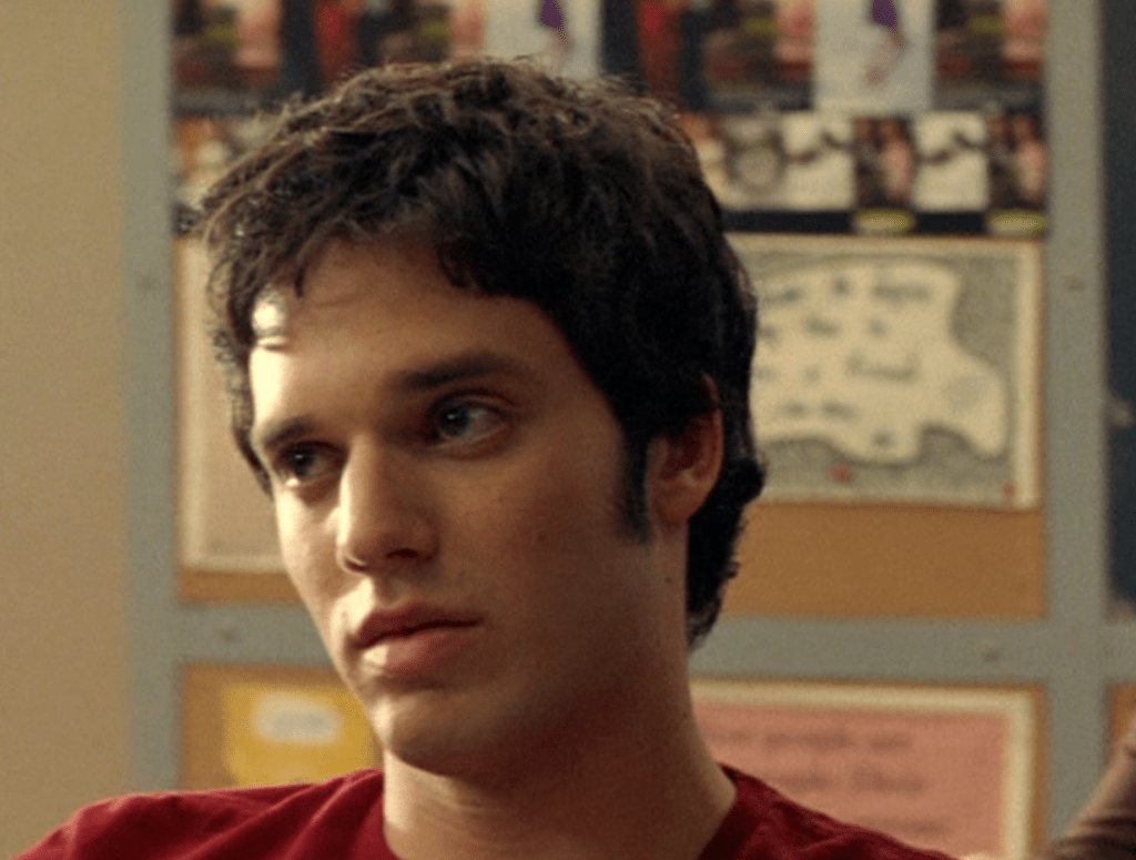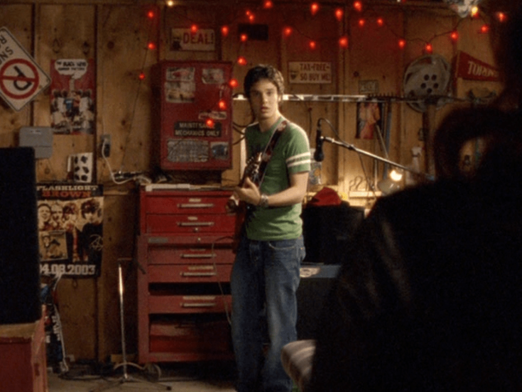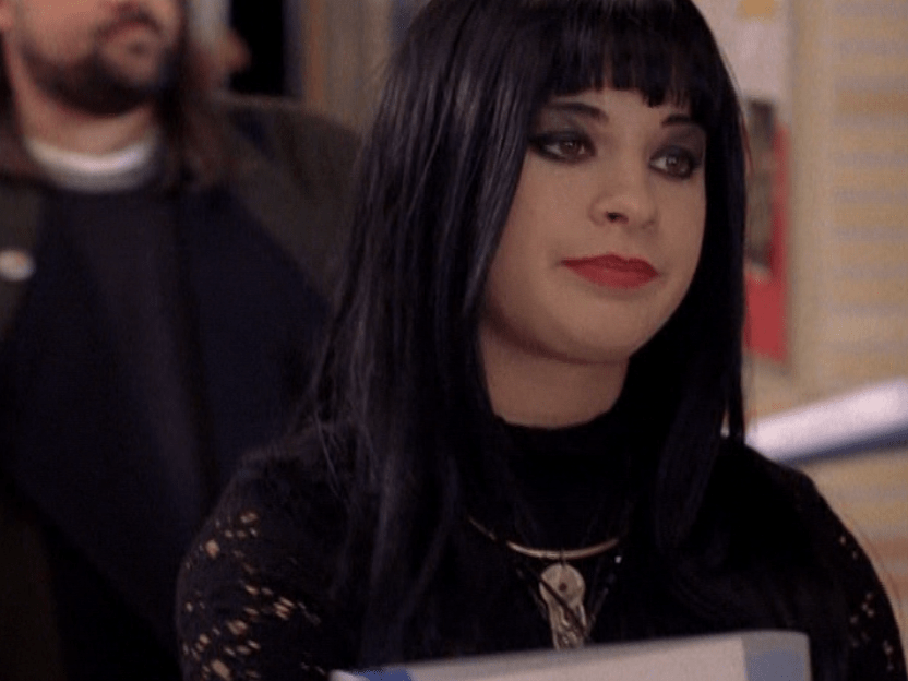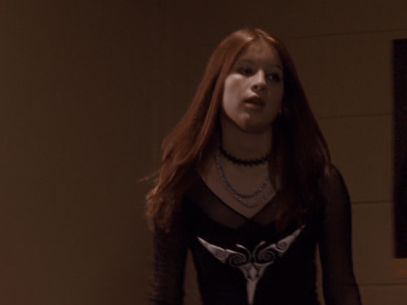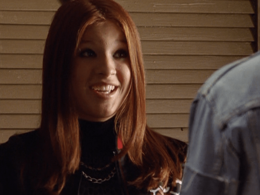 Anyway, so her hair loves the curling wand now. And her clothes are still pretty cool but she’s definitely devolving. lol. First she wears her Emily the Strange bag with a long sleeve shirt under a short sleeve shirt and her go-to o-ring necklace. She takes Jimmy to the museum in a leather jacket, studded belt, and these flare jeans that are freaking cuffed like 6 inches. She and Paige both. How short ARE these people?! I had to buy long length jeans back then. She’s seen briefly looking cute in maroon, and finally in some graphic tee, giving Jimmy a LEADING smile.