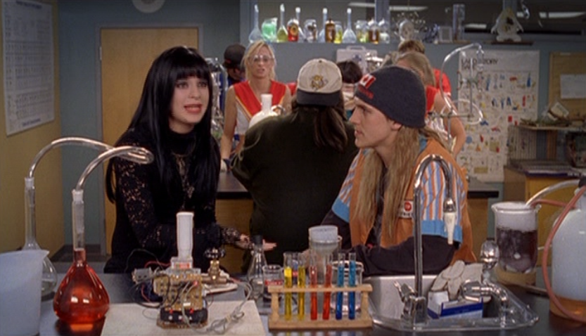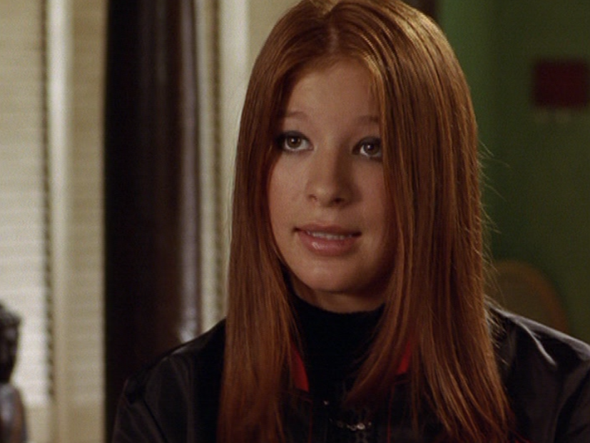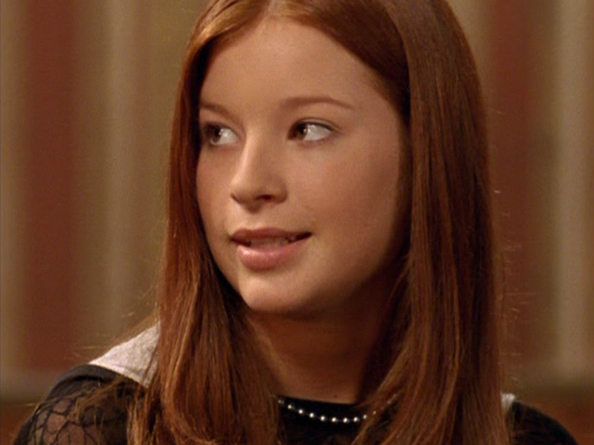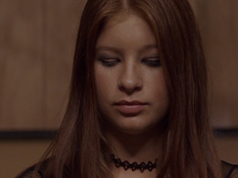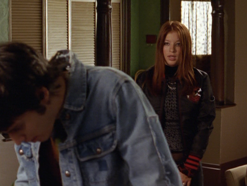 Anyway, so her hair loves the curling wand now. And her clothes are still pretty cool but she’s definitely devolving. lol. First she wears her Emily the Strange bag with a long sleeve shirt under a short sleeve shirt and her go-to o-ring necklace. She takes Jimmy to the museum in a leather jacket, studded belt, and these flare jeans that are freaking cuffed like 6 inches. She and Paige both. How short ARE these people?! I had to buy long length jeans back then. She’s seen briefly looking cute in maroon, and finally in some graphic tee, giving Jimmy a LEADING smile.