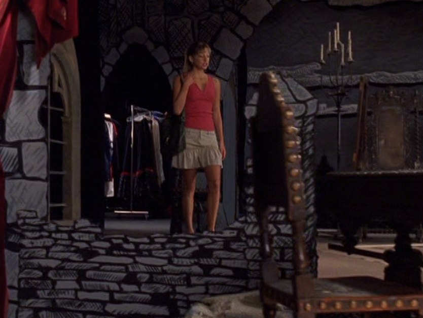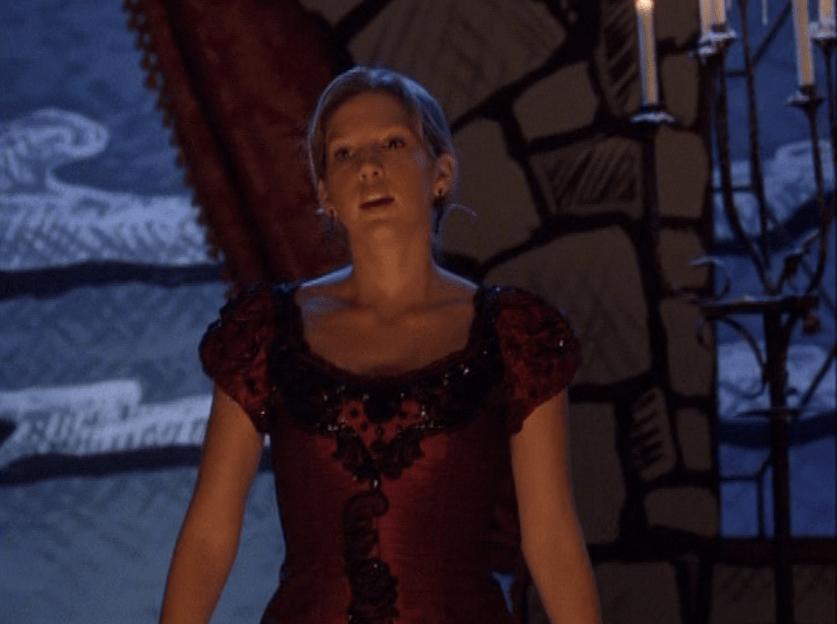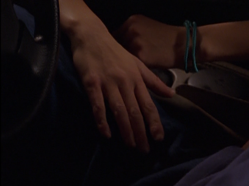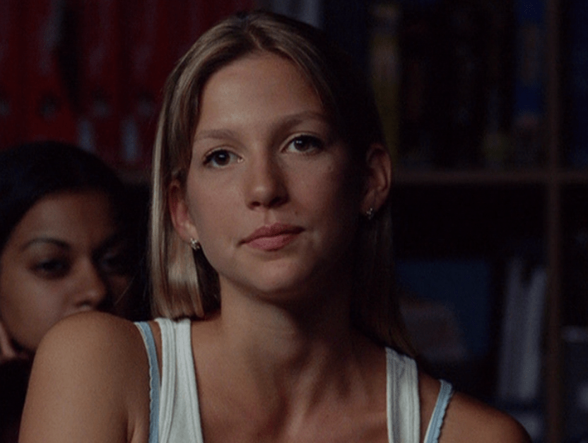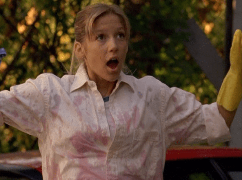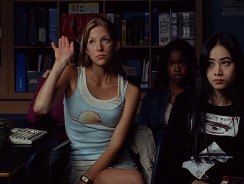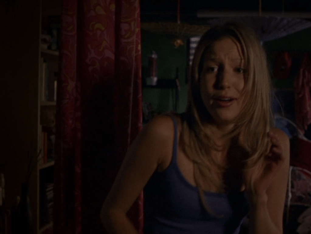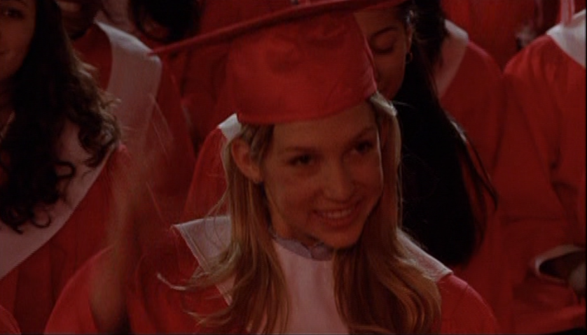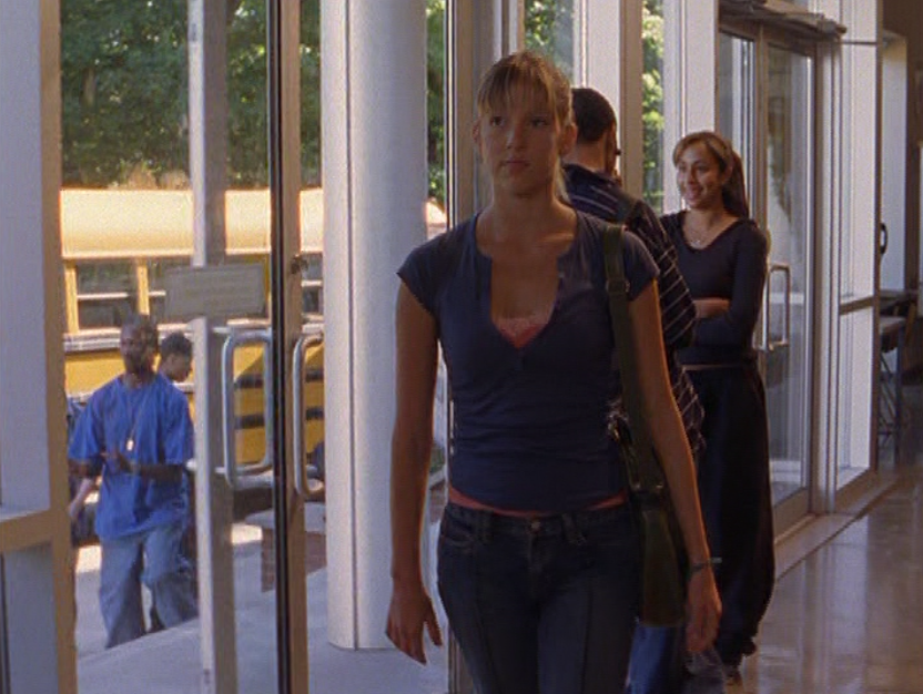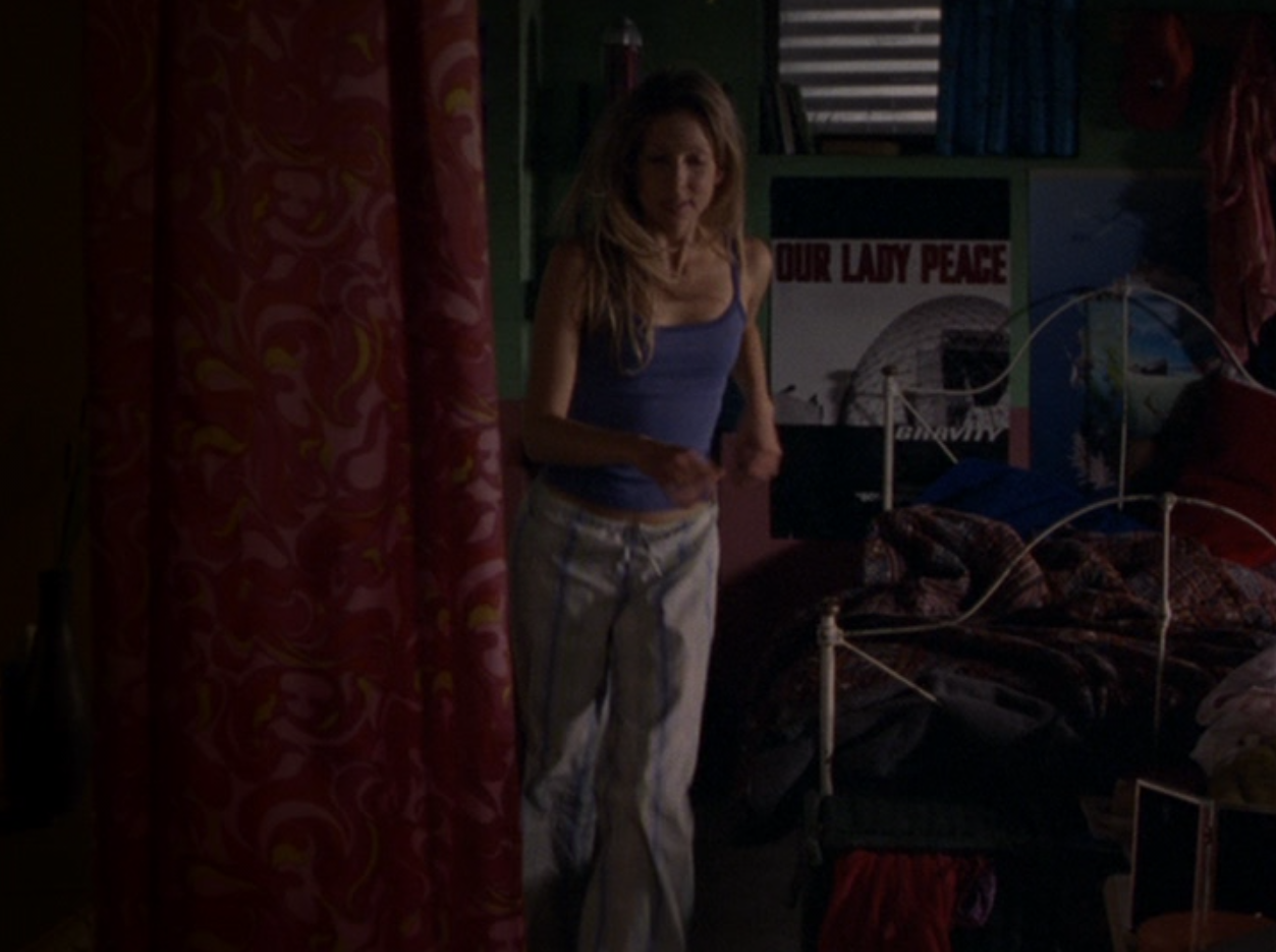 Aaaand here’s Emma, the star of the show!!! Everyone open wide and show your appreciation! I actually think her acting here is subtle but you can see the transformation. She still looks dead behind the eyes but has this new smugness, this new confidence about her. First she’s wearing all-tight-everything as we did back then. Tight ponytail, tight shirt layered over another tight shirt, and tight low-rise pants. She’s also carrying her signature bag. Her costume in the play looks beautiful – that red dress with black detail! Oh yeah, and I got a shot of the bracelets. Idk if I said this already, but it would have been cool if there was like, more awareness of these bracelets and what they mean. It seems that only a small circle of ravine-dwellers are even aware of this form of communication. Next outfit is a khaki skirt, a peachy tank, and the first inkling of gonorrhea symptoms. Oh yeah, and Emma has one of those loopy ponytails! And lastly, Emma is in her PJs – man, this family really loves Old Navy – and cries REAL tears becaaaaause she thinks she has an STI.