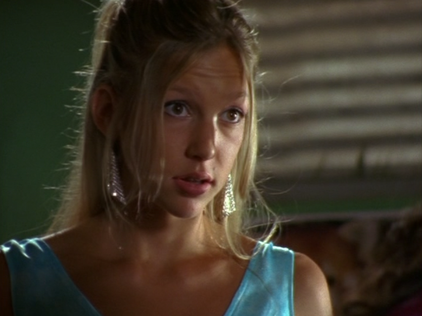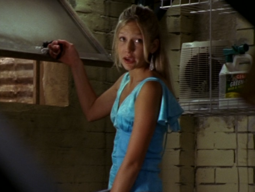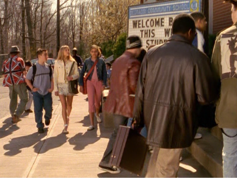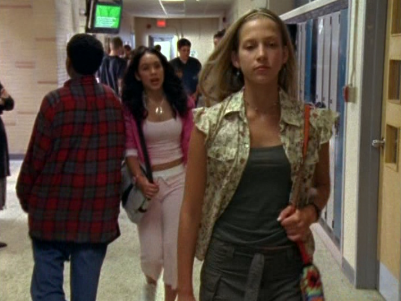 I recall someone, somewhere – I think it was Miriam herself – saying that these ‘fits, particularly the green one, are Lululemon. So use that information how you will. Ah yes, athleisure is creeping into our lives early. If only we would have known that soon, people everywhere would be going to sit-down restaurants in leggings and tennis shoes. First she’s in this powder-blue, fitted zip up hoodie over a white cami. And we have to talk about the hair. Not my favorite. The bangs are actually something I would have considered 90s bangs, ya know? Kinda thin, kinda long. I never really thought these were actually in style at the time she was wearing them. The next outfit is the green top & jacket set, which she wears with flare pants, and I believe Birkenstock clogs. These were also uncool by 2004, unless you were a hippie. She also is wearing her famous Che Guevara purse. In PE she wears a tiny green tank and little khaki shorts. And the final outfit is a tight blue tee with a tank peeking out, a jean skirt, and these cute shoes that look like Airwalks or Converse or something.
